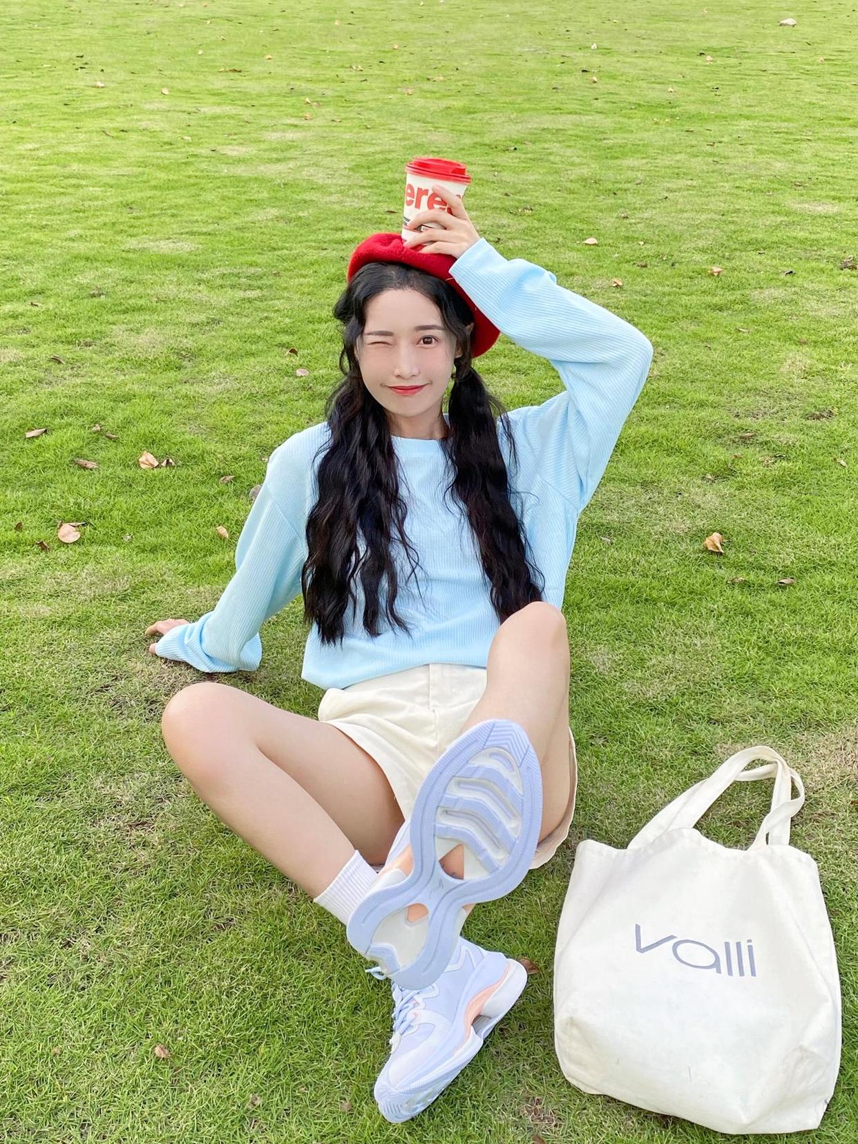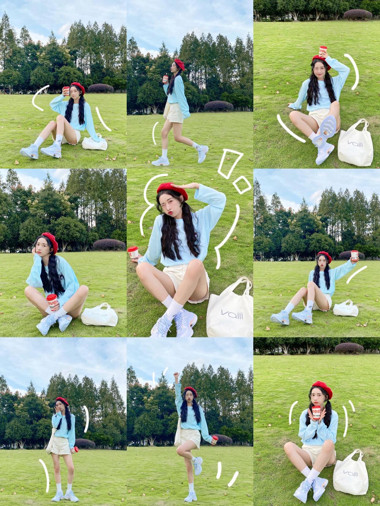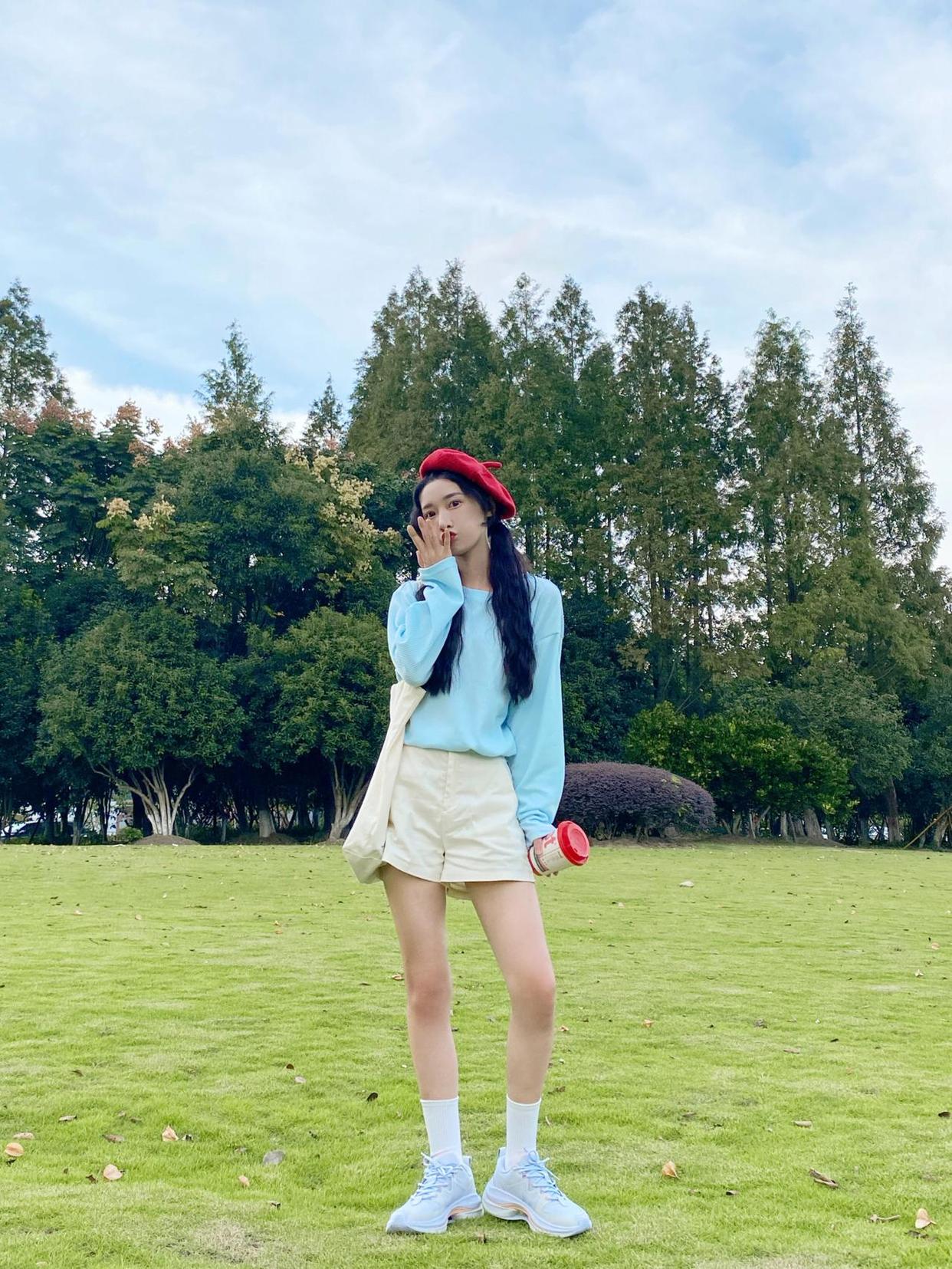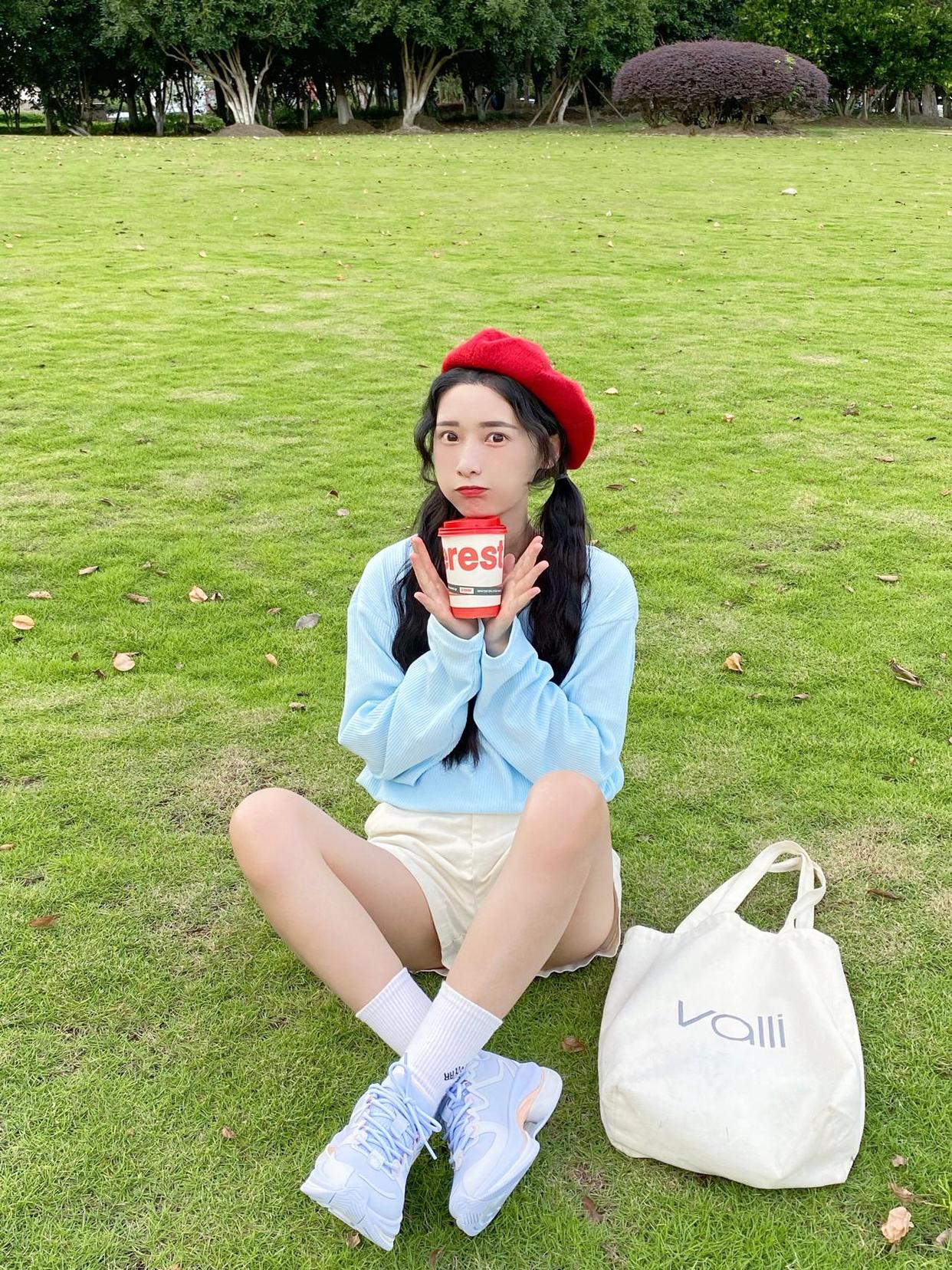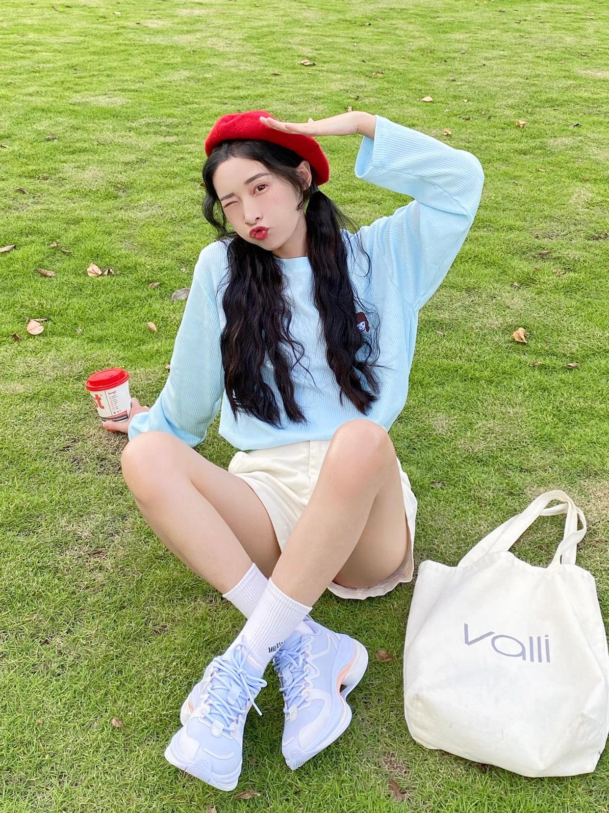 除了上面的基本盘腿坐,也可以参考下图的模特,半弯曲腿向镜头一侧延伸,手撑地让身体往后仰,能够起到拉长身体比例的视觉效果,小个子也能拍出大长腿。