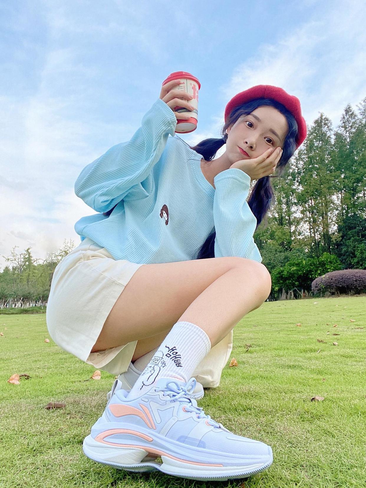 活力满满的感觉可以通过镜头互动的方式来实现,人物坐在画面前方,身体往后仰,抬起一只腿假装踢镜头,和镜头来个亲切的互动,这样拍照可以很好地拍出自然感,也不会显得拘谨。