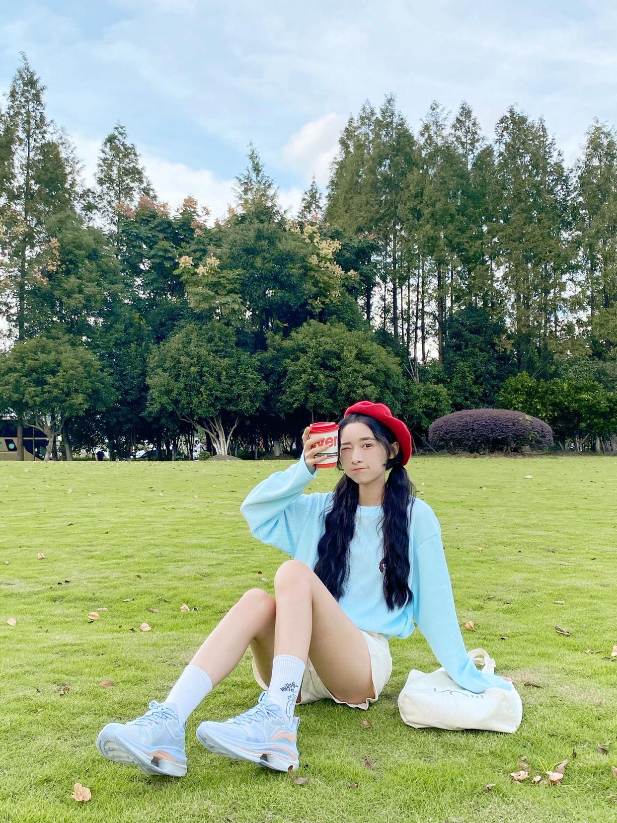 坐在草地拍照的方式有很多,除了基本地向镜头侧前方延伸腿,显得腿长之外,还可以盘腿坐下,为人像制造更多的三角形轮廓,记得膝盖尽可能避免直对镜头,角度也要微微侧,显瘦不少。