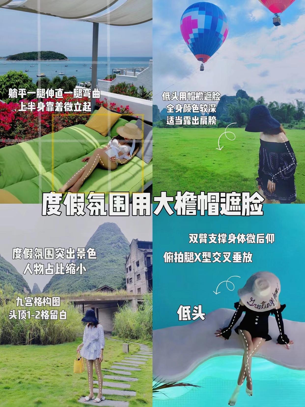 外出游玩拍不露脸的照片,帽子就是很好的辅助道具,不论是站着、蹲着、躺着都很适合用大帽檐来遮脸,配合人小景大的构图,人物适当低头,突出景色的同时也能制造神秘感。