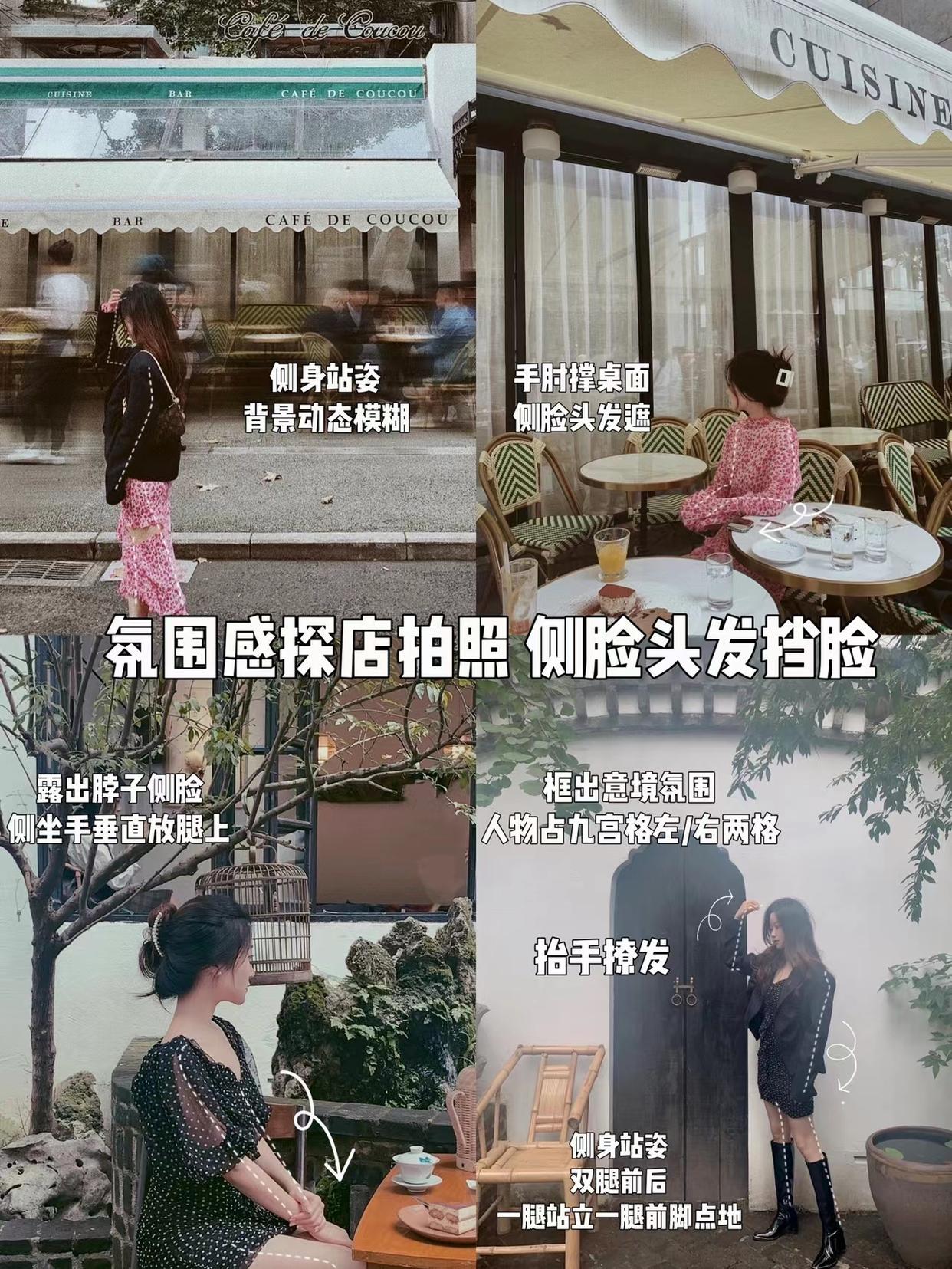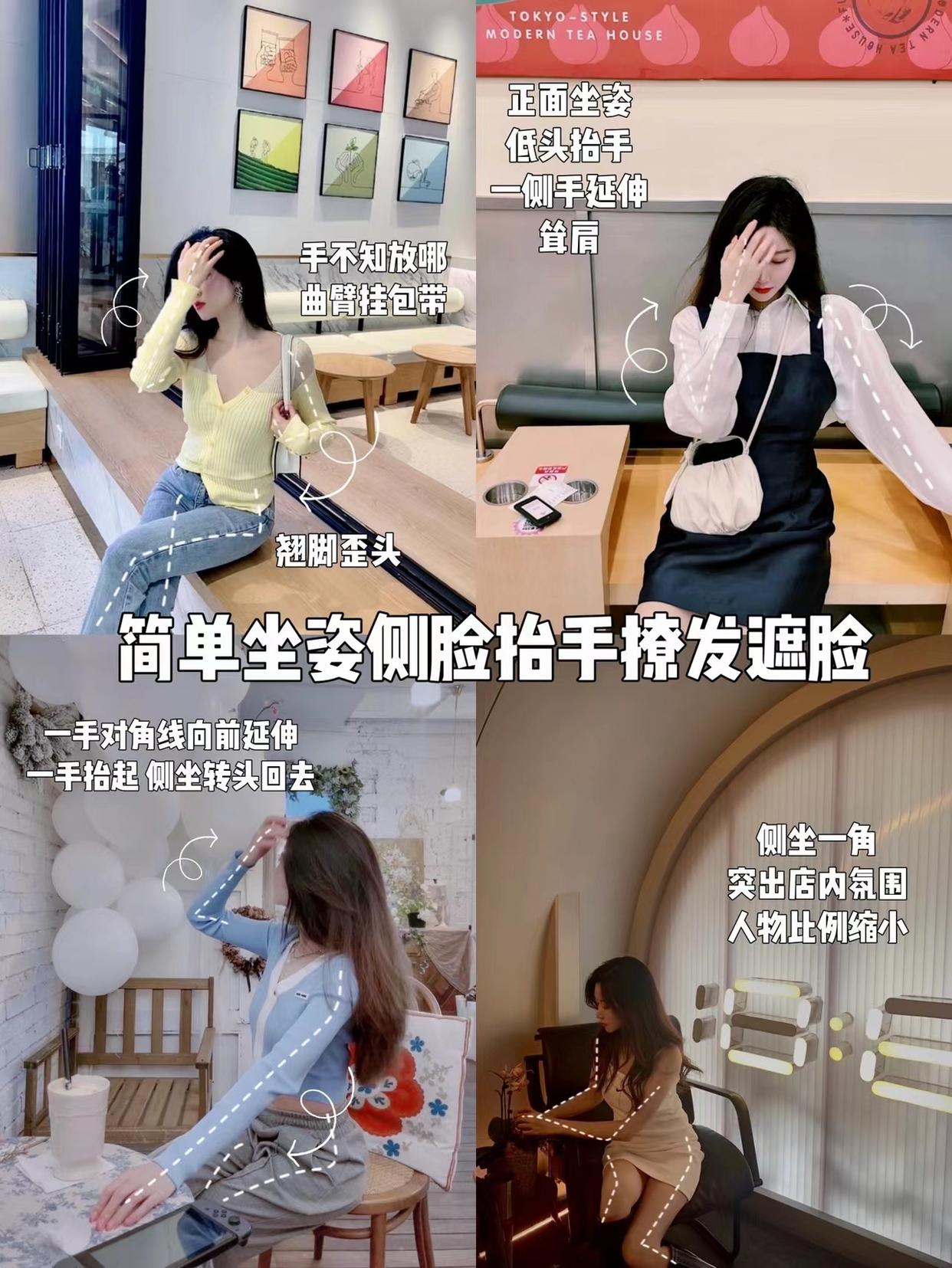 简单坐姿,脸侧着对镜头,抬手撩发遮住自己的半边脸,也可以参考下面的模特,一手对角线向前延伸,一手抬起,侧坐转头回去,探店这样拍照准没错。