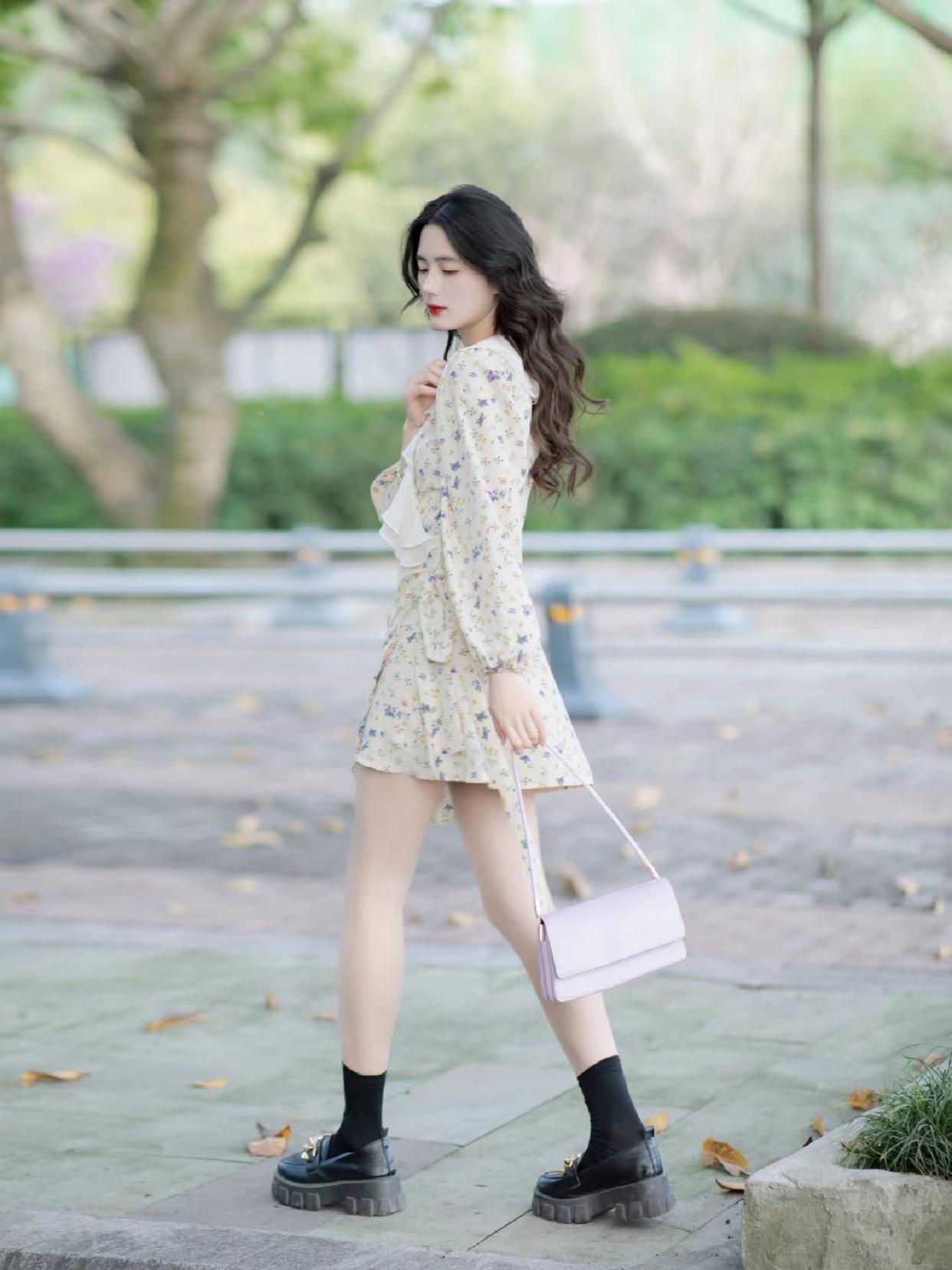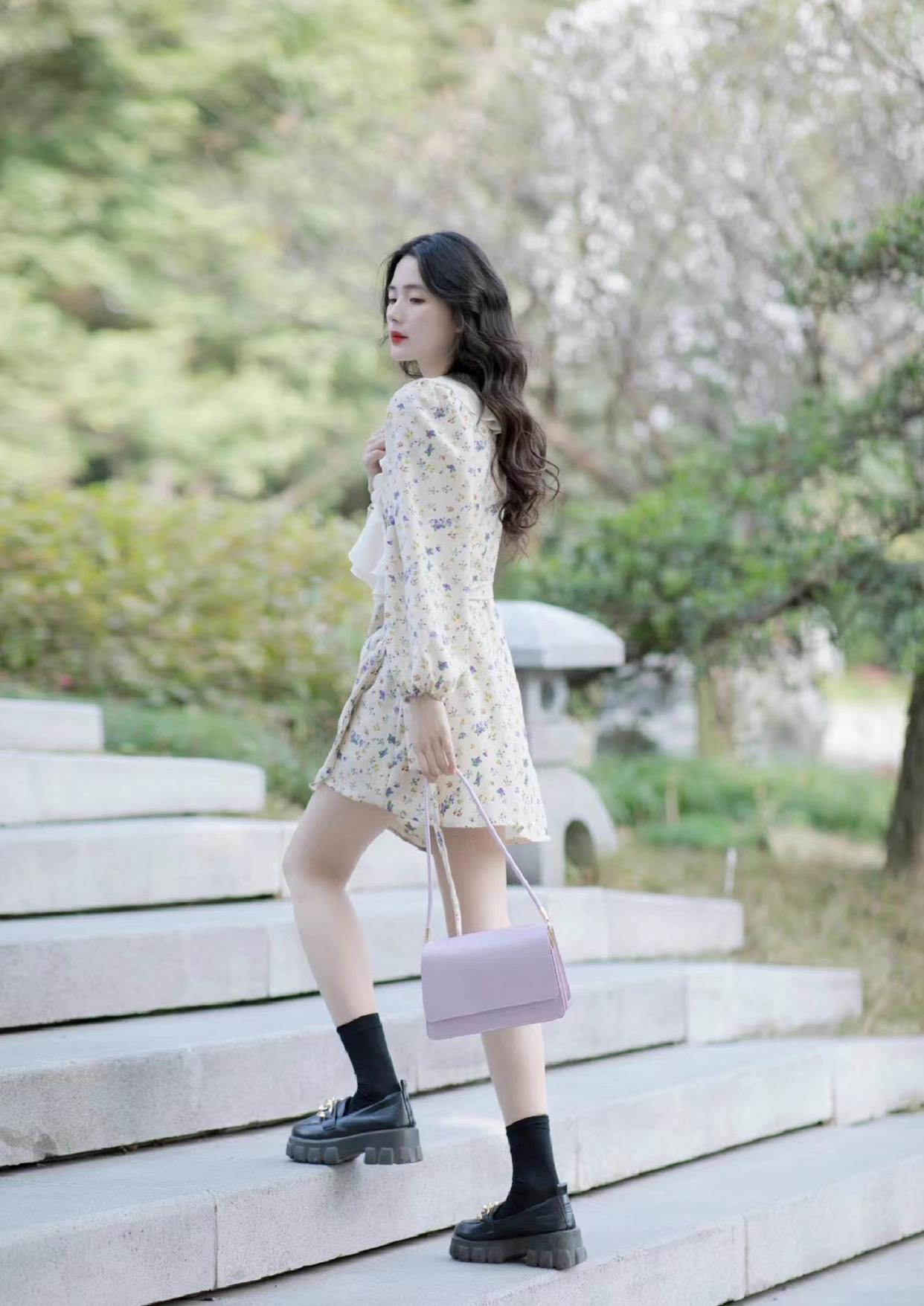 穿裙子拍照的时候仪态也很重要,正面想要拍出直角肩的话可以稍微耸肩,再将头歪向一侧,双手交叉拎包,这样可以避免正面拍直站的尴尬,