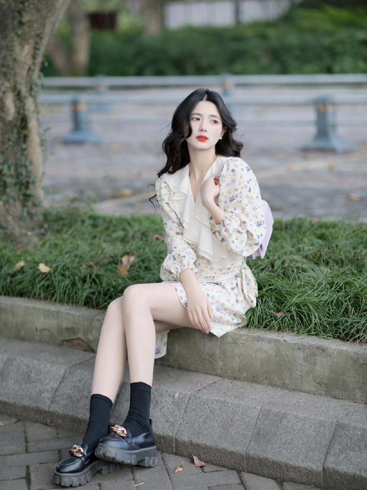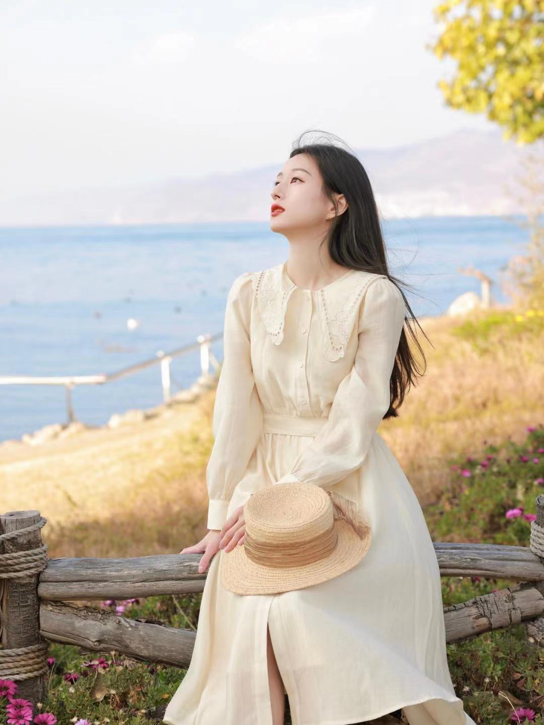 有时候越简单的姿势越有高级感,找个背景好看的地方坐下,迎着风,安安静静地坐着,眼神往前看并注意视线前方留白,这样极简的姿势能营造出清新、文艺风,拍照很有感觉。