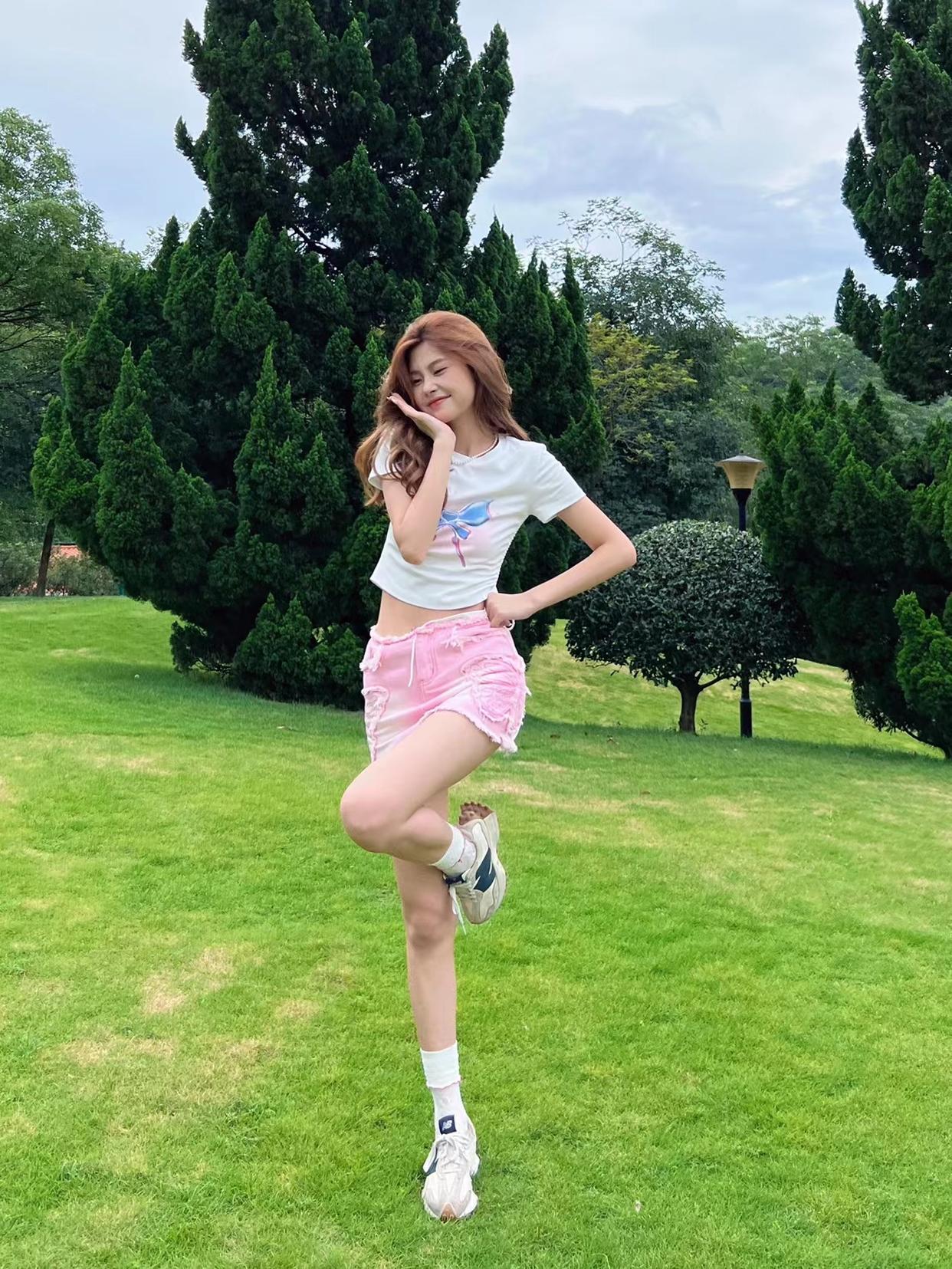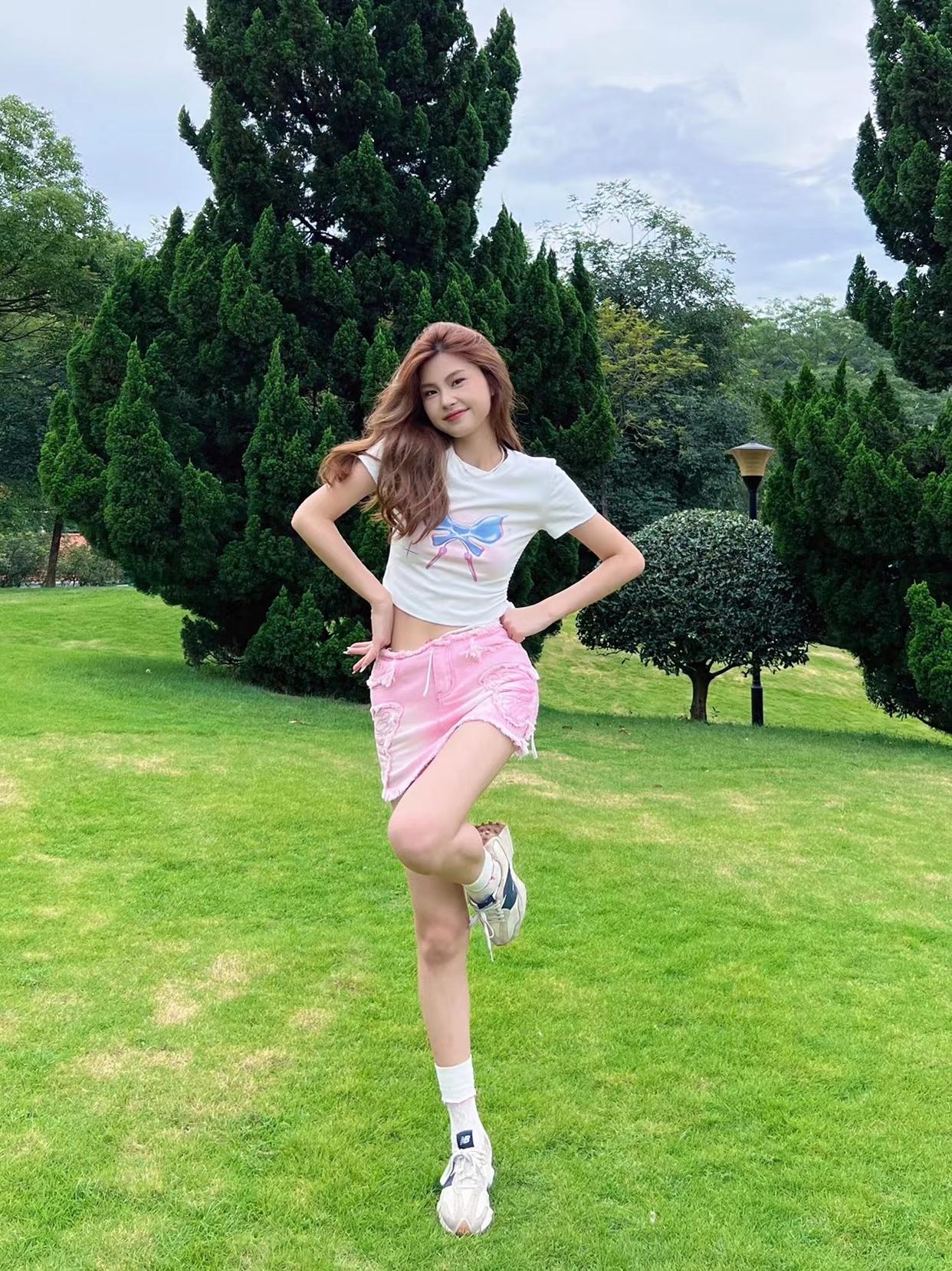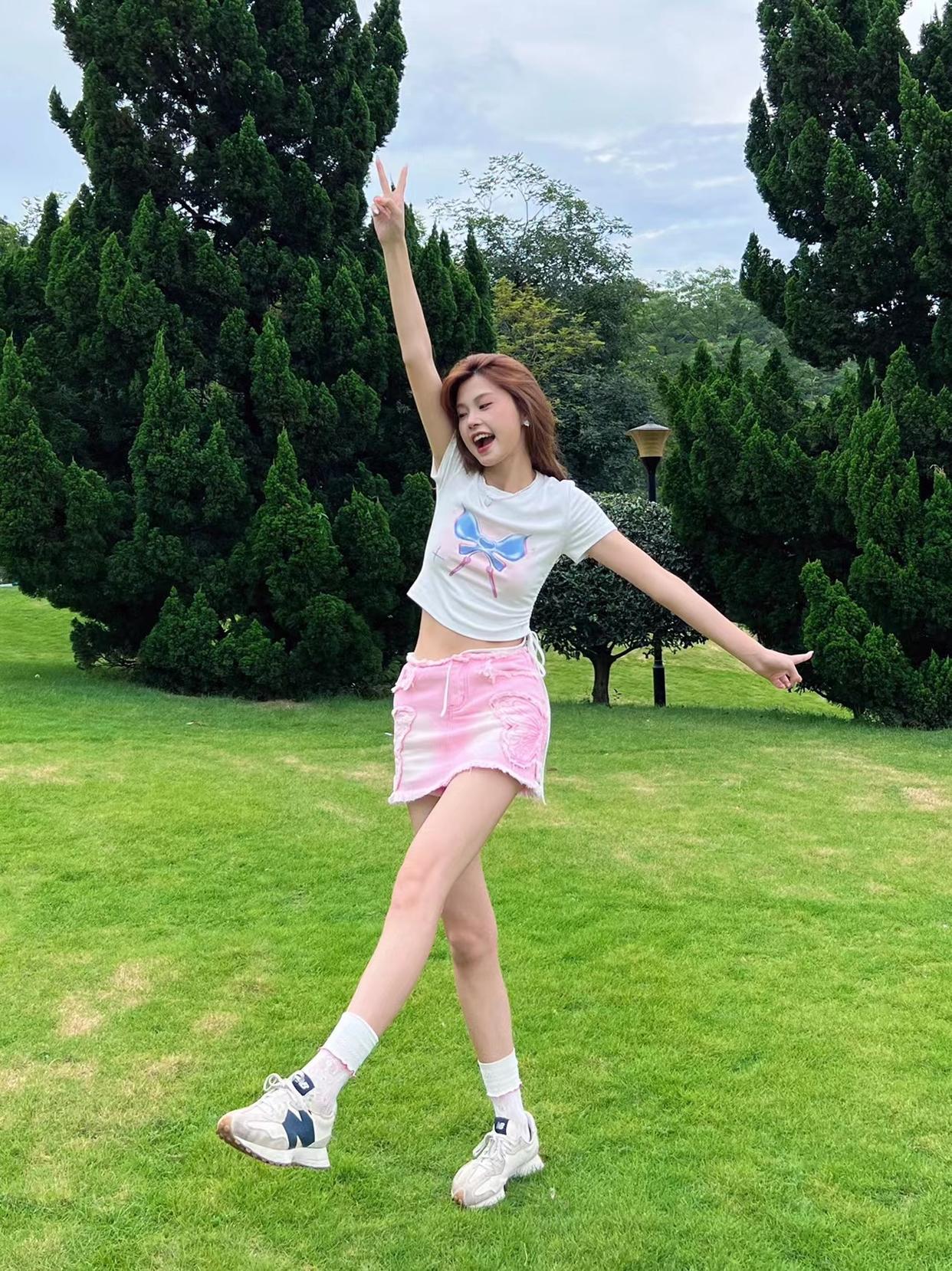对于腿型不算好看的女生来说,拍全身照时交叉腿站是必备的姿势, 能够让你避开腿型问题,搭配一个举手比耶的动作,举起的手在视觉上能作为身高的一部分,显高显瘦显腿长。