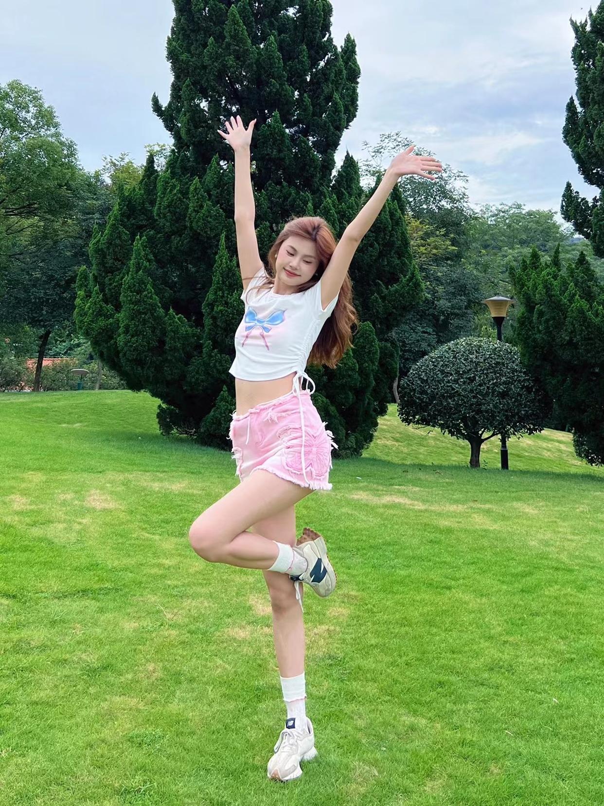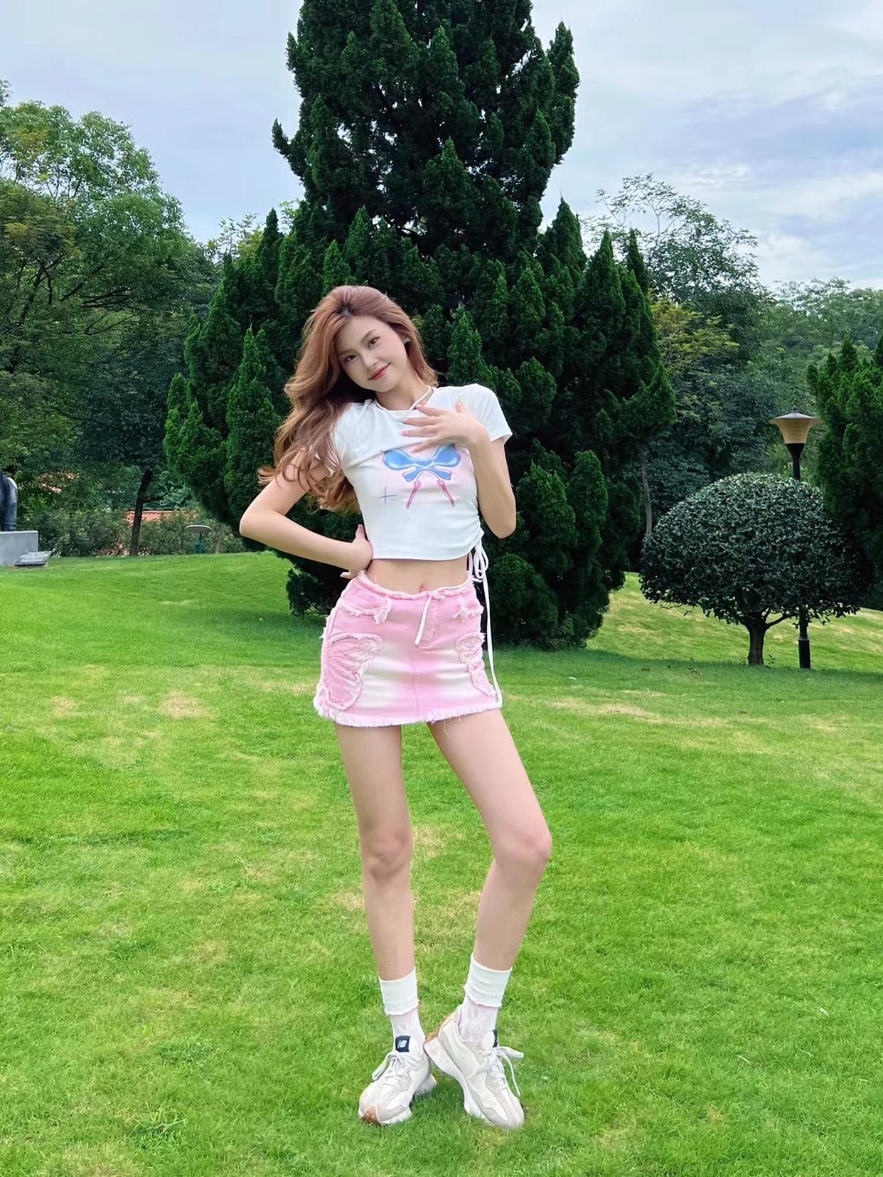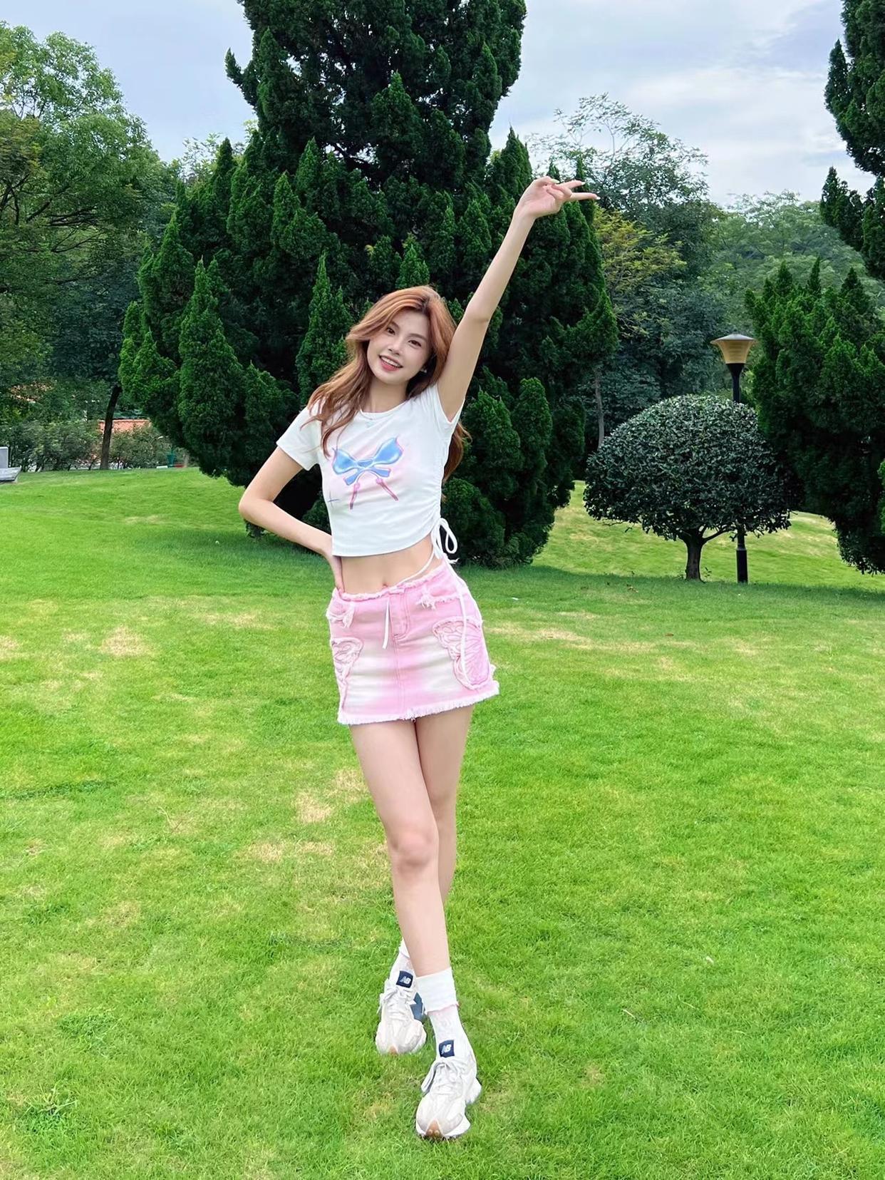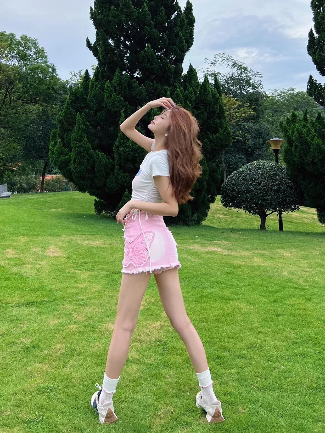 对于腿型不算好看的女生来说,拍全身照时交叉腿站是必备的姿势, 能够让你避开腿型问题,搭配一个举手比耶的动作,举起的手在视觉上能作为身高的一部分,显高显瘦显腿长。