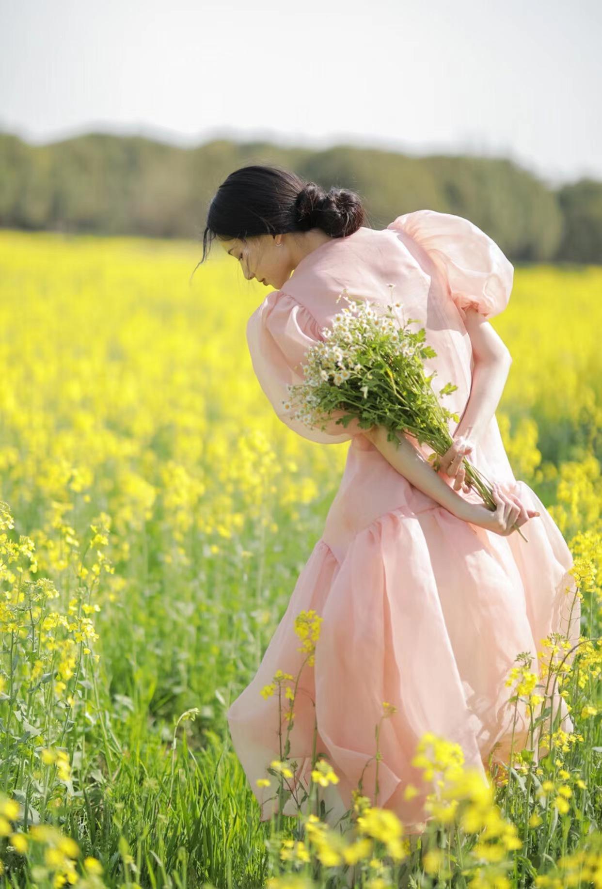 到花海中游玩拍照,服饰的选择上最推荐的还是飘逸的长裙,尤其是在动态的状态下,比如奔跑、走动、旋转、跳跃等姿势上,氛围感很强,给人仙气满满的既视感。