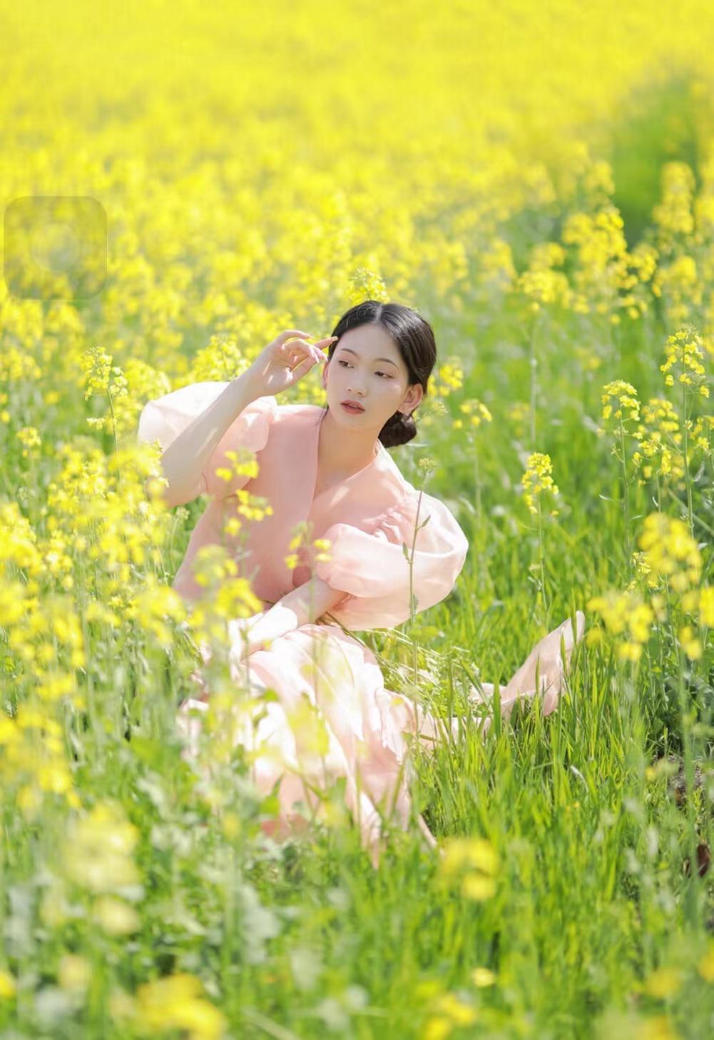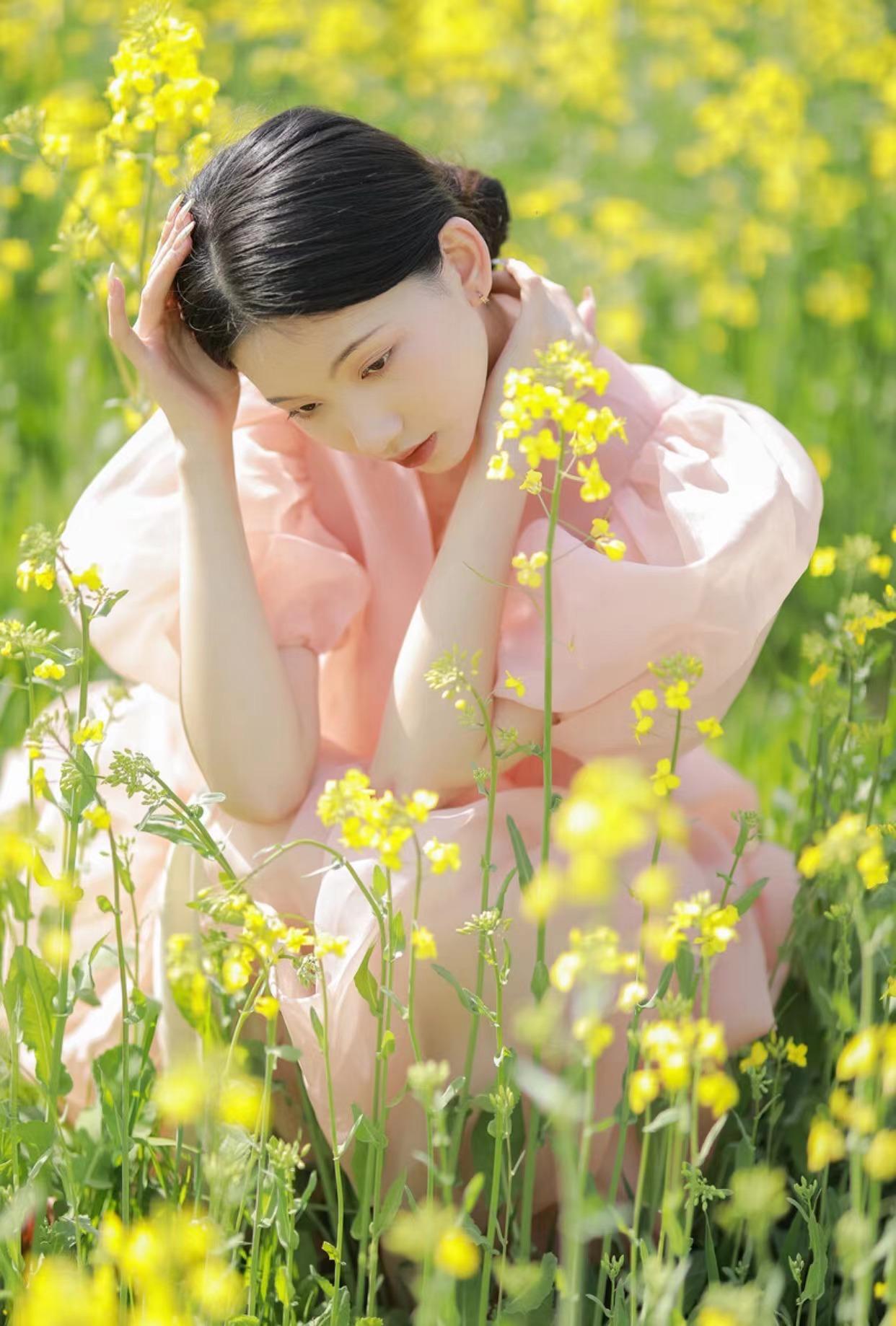 以油菜花为背景,适当地放大环境的元素,让人物蹲在花间小道之中,制造出一种人物被花海包围的感觉,此时再不看着镜头拍摄,带点不经意的美感,也能协调好环境与人物的关系。