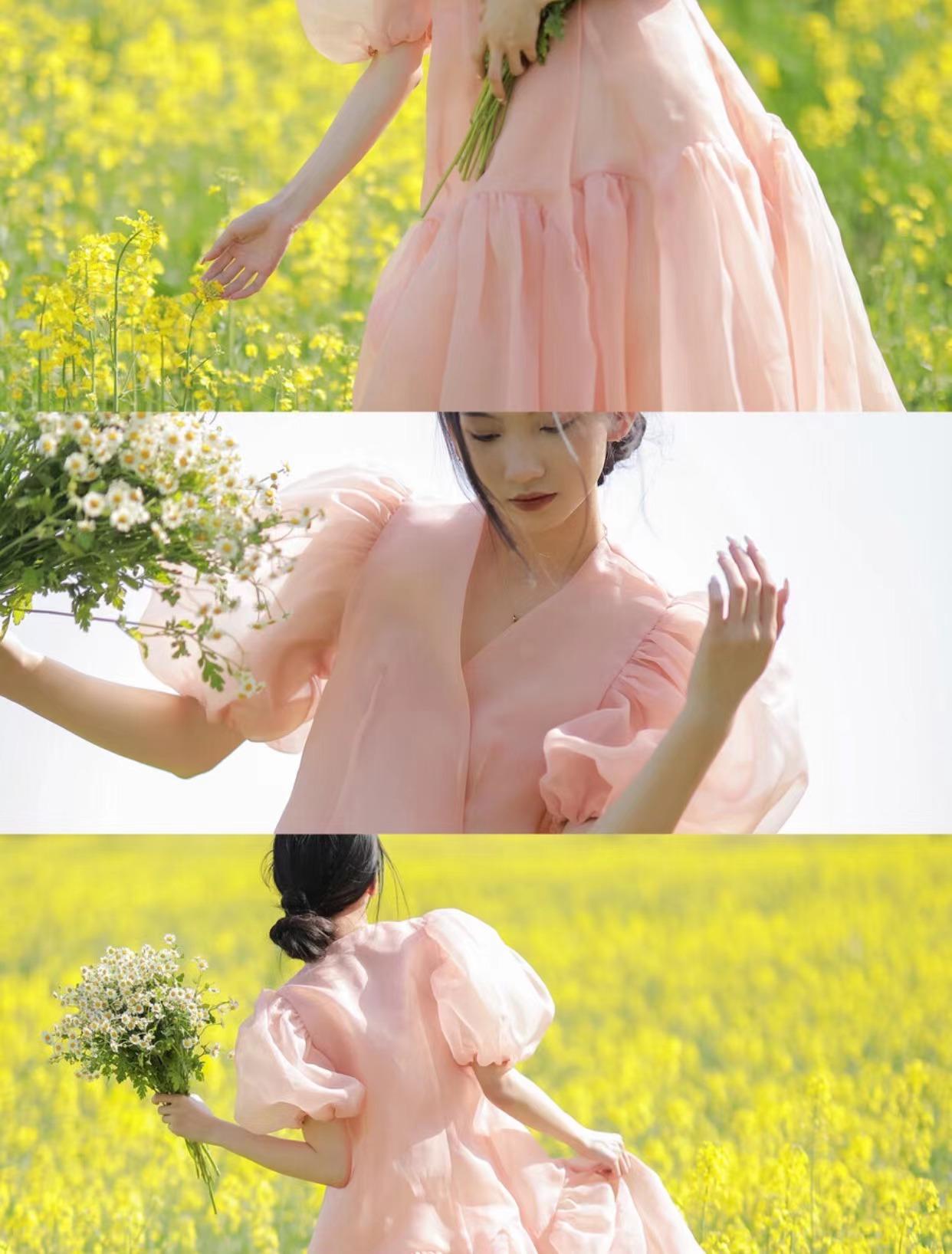 当人物在花海中动起来的时候,摄影师可以快速地按下快门记录这一系列的动作,再选择动作、表情都自然的照片拼接成长图,这种连拍构图往往更具故事性和文艺的感觉。