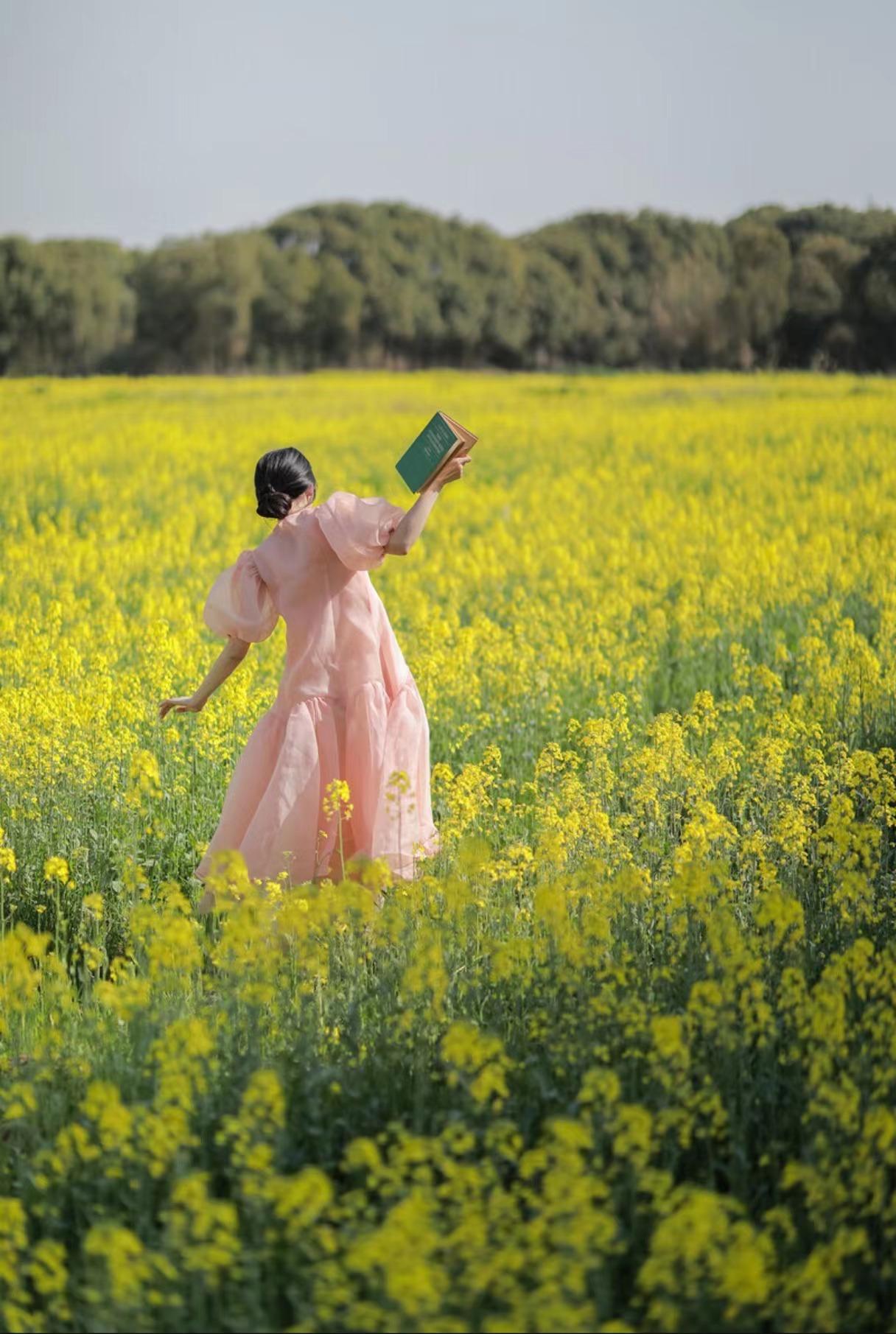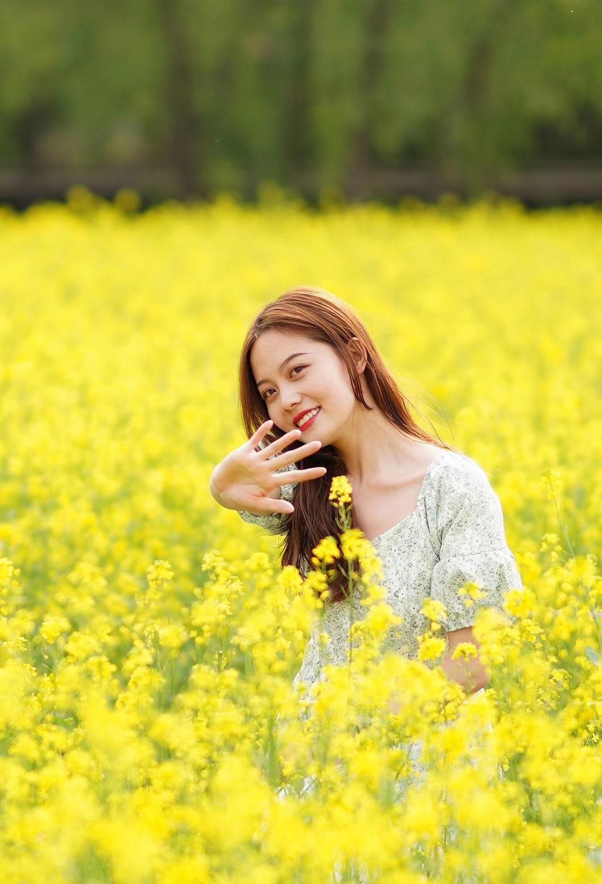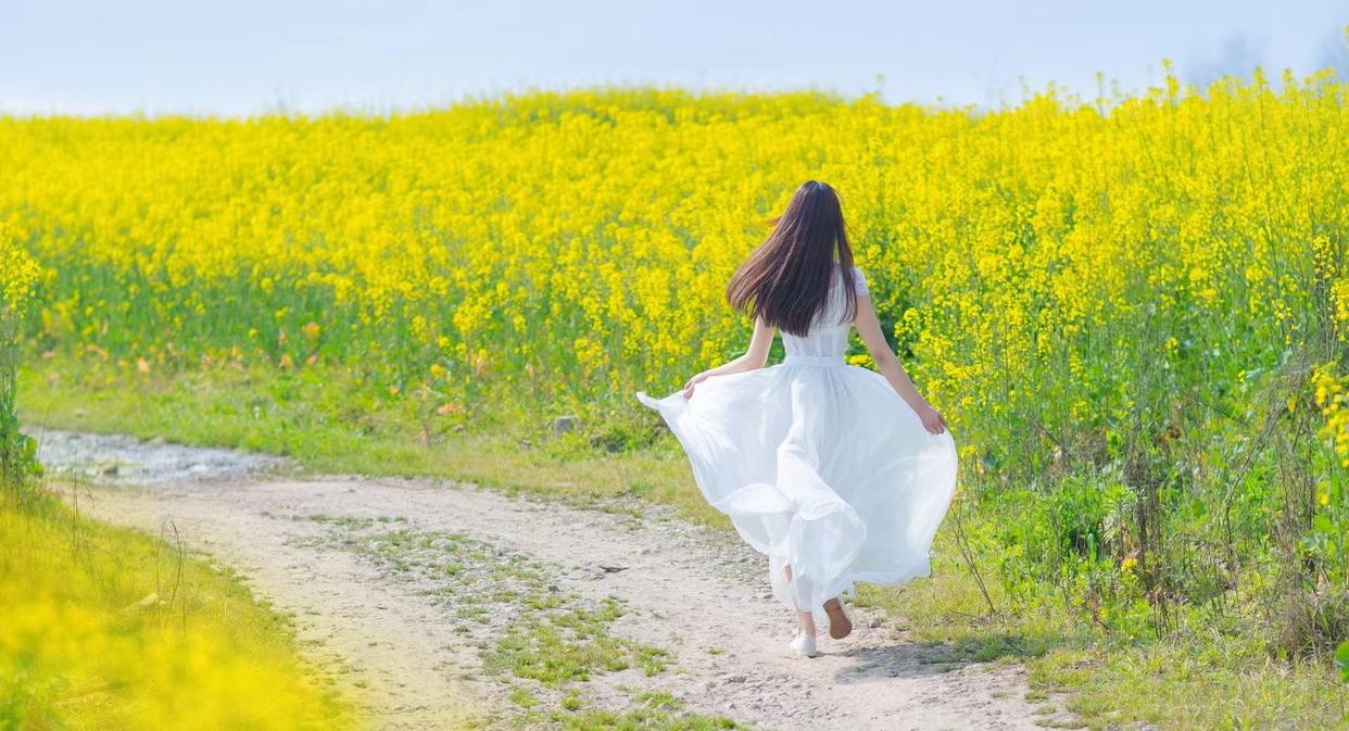 拍油菜花人像时,想要达到显瘦的拍摄效果,就要注意手部与身体躯干保有一定的距离,像下面的模特一般,在花海中张开双手,一来视觉上能显瘦,二来也能营造出文艺的感觉,即便拍背影也能很美。