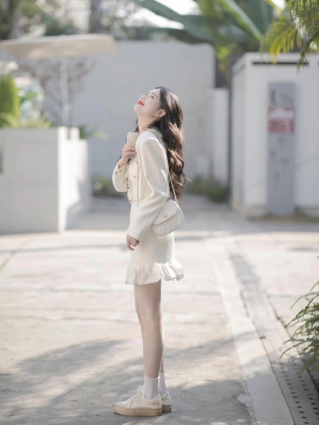 穿裙子的时候,越是简单大气的姿势,效果往往越好,不知道怎么摆放双手的时候,大家可以学以下女生,双手交叉握,头微微倾向一侧,搭配一个甜甜的微笑,知性又治愈。