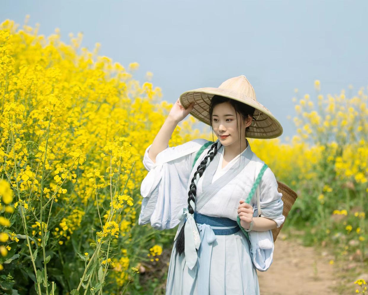 只拍半身照的情况下,手部摆姿很重要,可以借鉴下图姐姐的动作,站在花海之中,半身侧对镜头,头45度抬起,手轻轻搭在帽檐之上,姿势干净利落,端庄又大方。