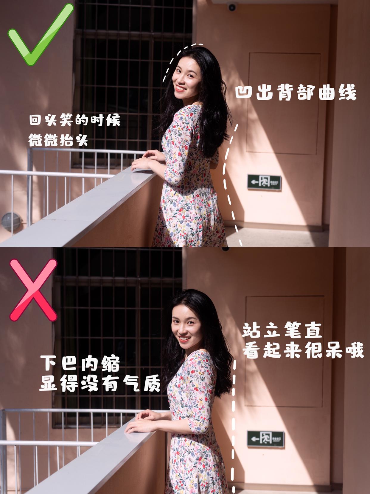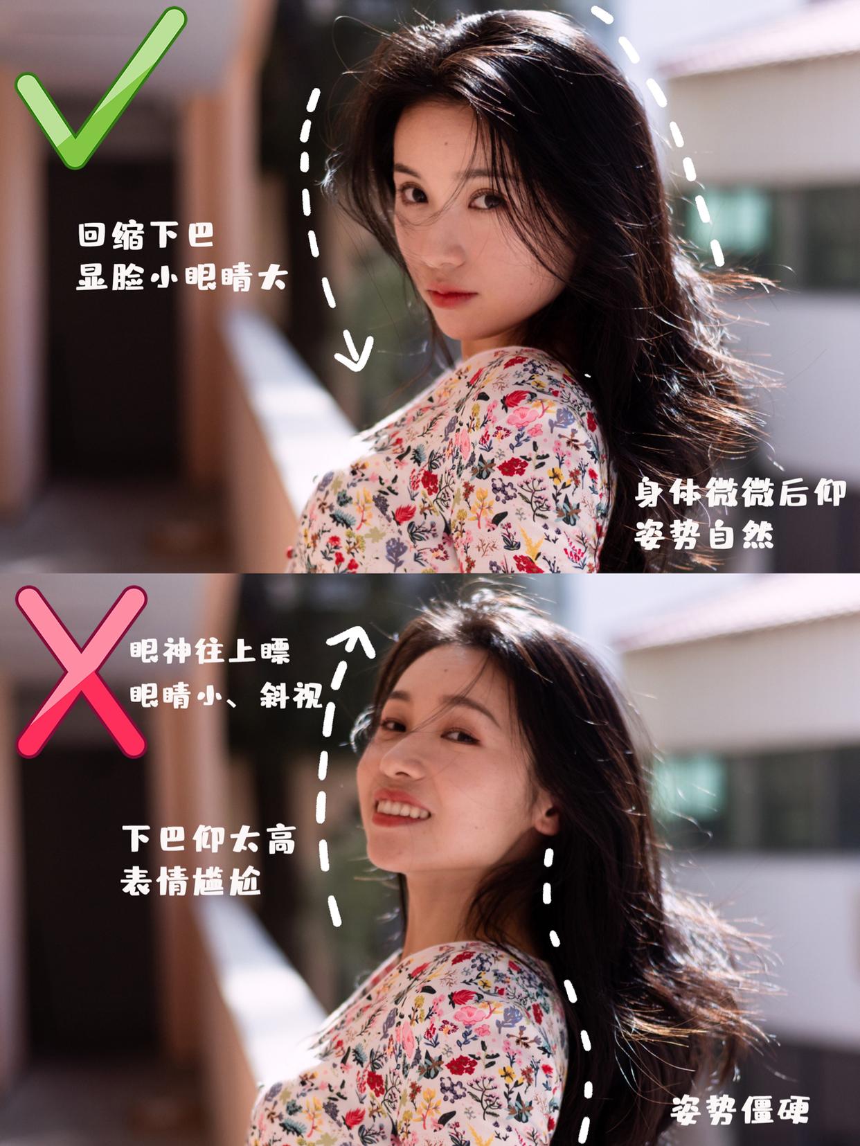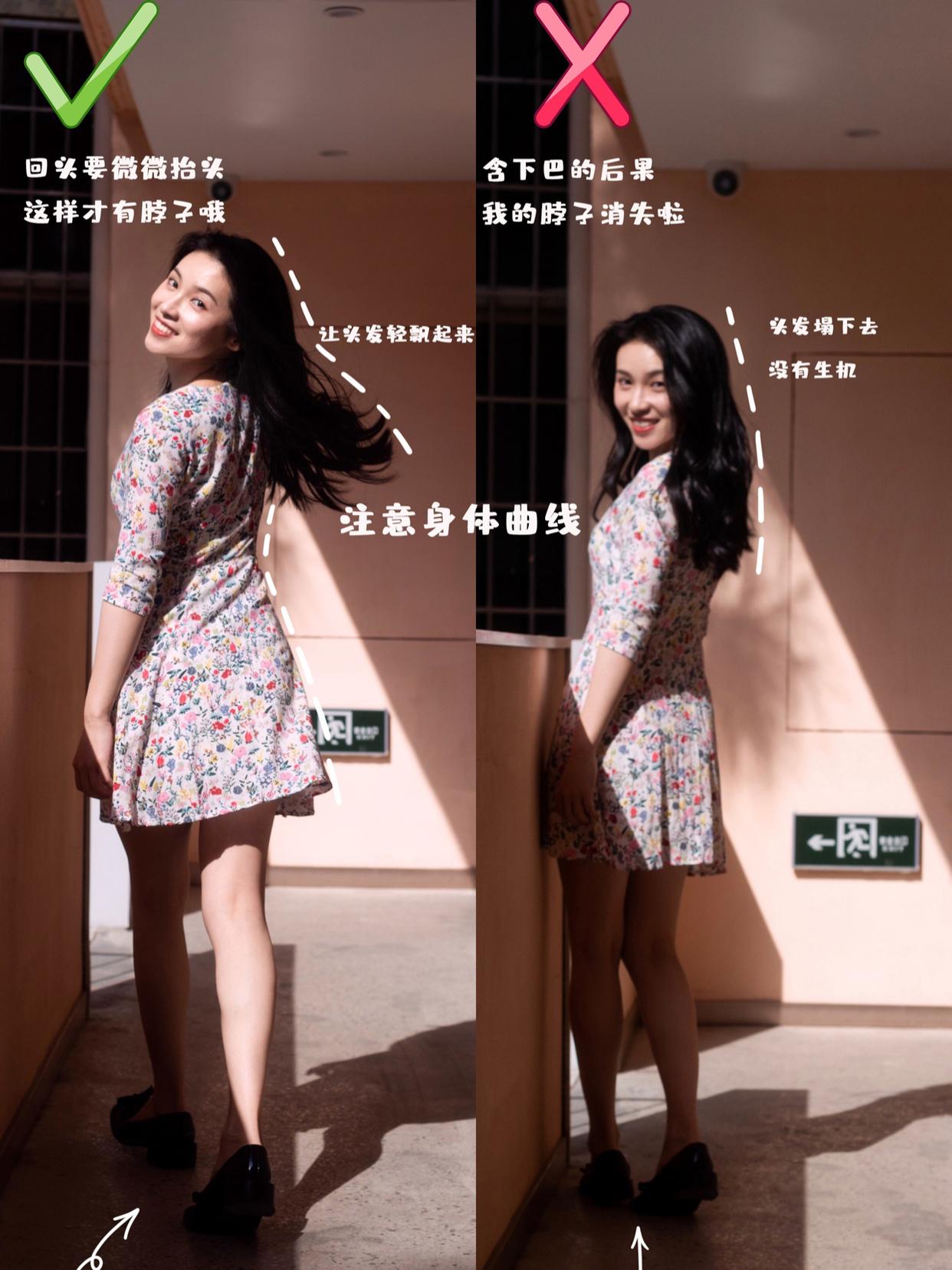 虽然说回眸笑是很有魅力的姿势,但也有技巧讲究,比如回头时要微微抬头,这样才能有脖子,同时,身体也要有侧身的幅度,避免眼白漏出过多,才能保证照片的好看。