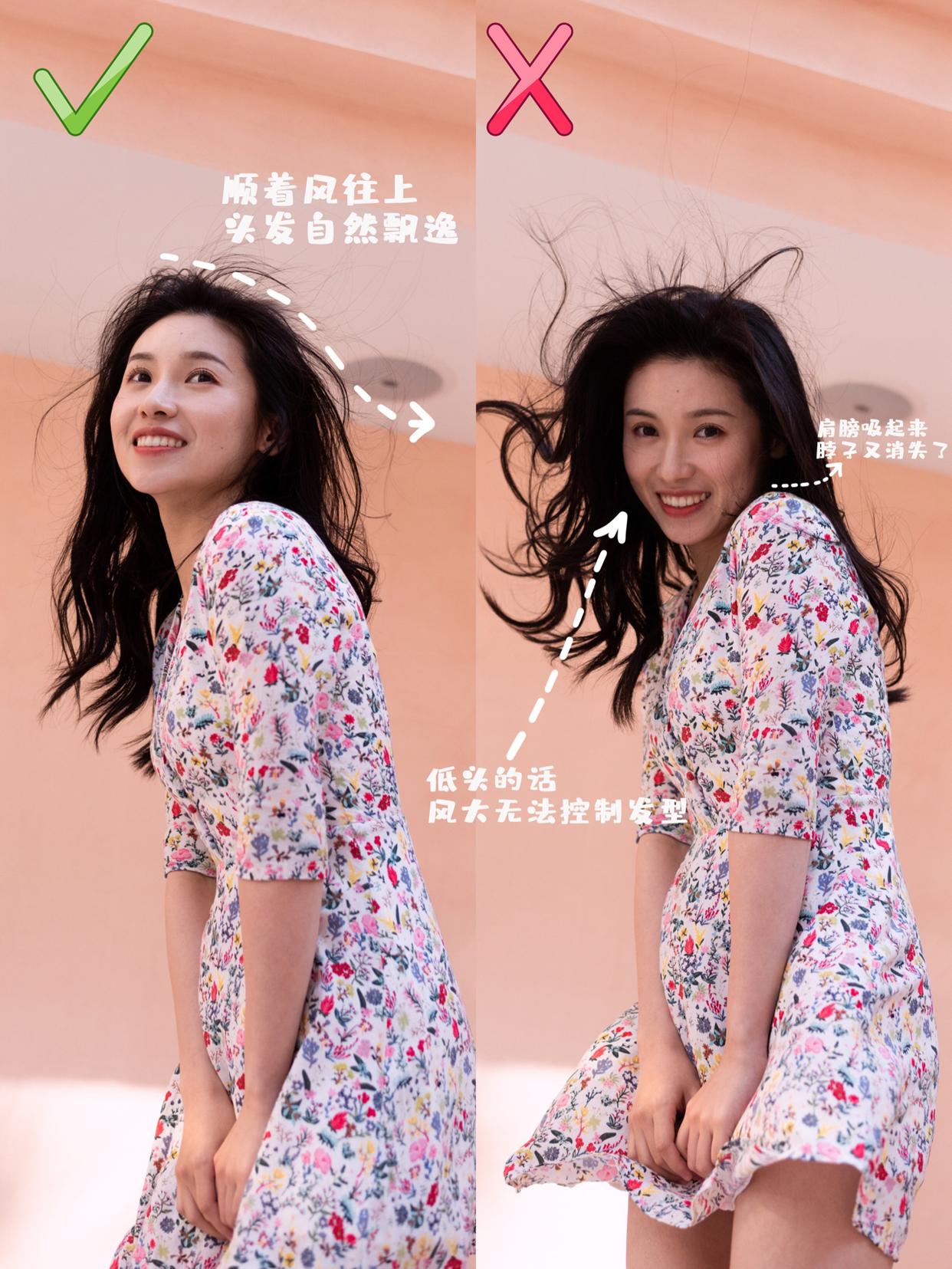 如果风不是从正前方方向吹来,那么在拍照时尽可能别低头,顺着风的方向拍,发丝更飘逸,同时也能避免低头时挤出双下巴,颈纹,甚至是表情无法控制的情况。