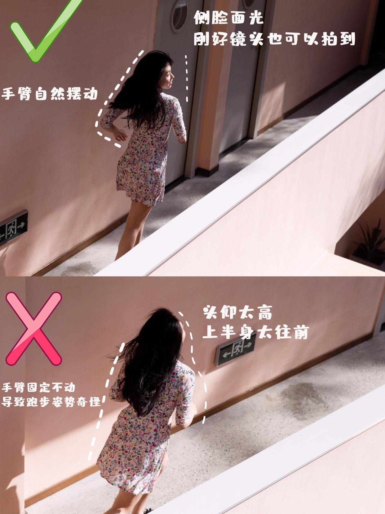 想要捕捉到好看的动态图,可以像下面的模特一般,背对着镜头,侧脸面光,同时保持手臂的自然摆动,背面拍和自然的动作,是提高出片率的关键之一。