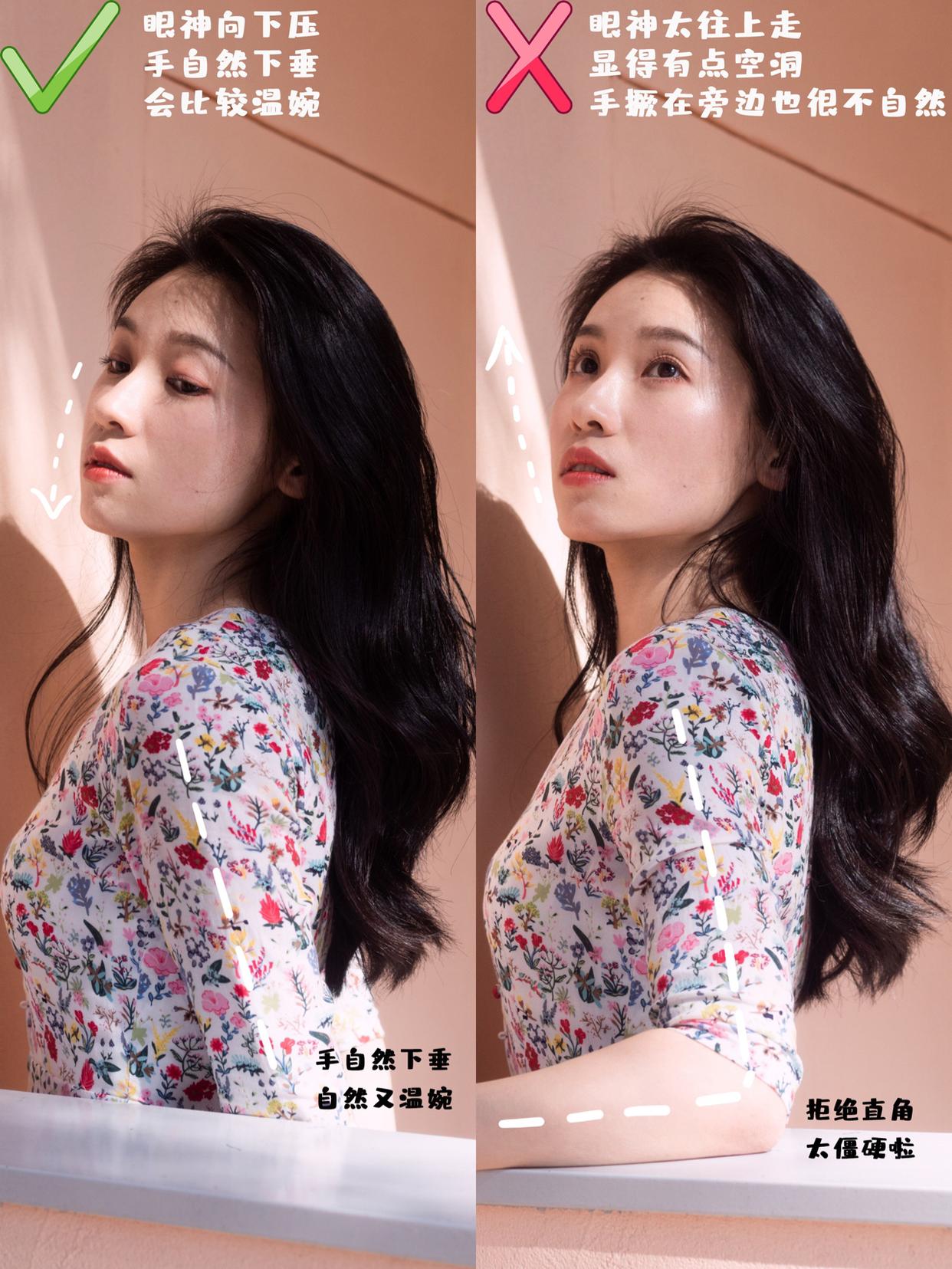 表情管理也是很重要的一项,当拍摄重点放于面部时,可以参考下面的模特,露出侧颜,眼神向下压,手自然下垂,这样就不用担心眼神会空洞,反倒增添了几分忧郁的感觉,让照片整体更高级。