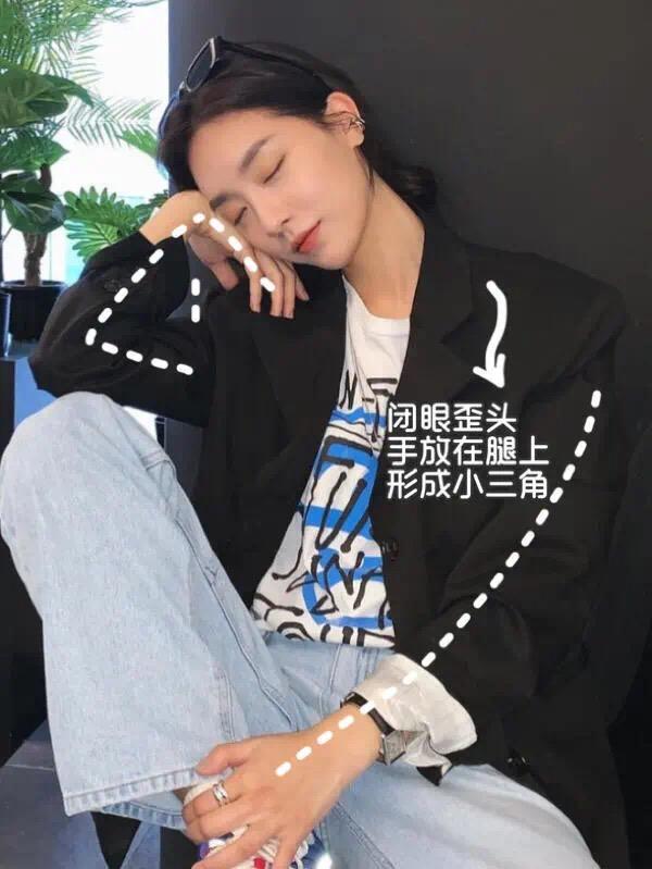 随性的坐着,手放腿上形成自然的三角轮廓,闭上眼睛表现出很享受的状态,同时撑着的手顺势贴着脸庞,一来起到视线指引的效果,二来也能撑脸显瘦,很适合甜酷风的女生。
