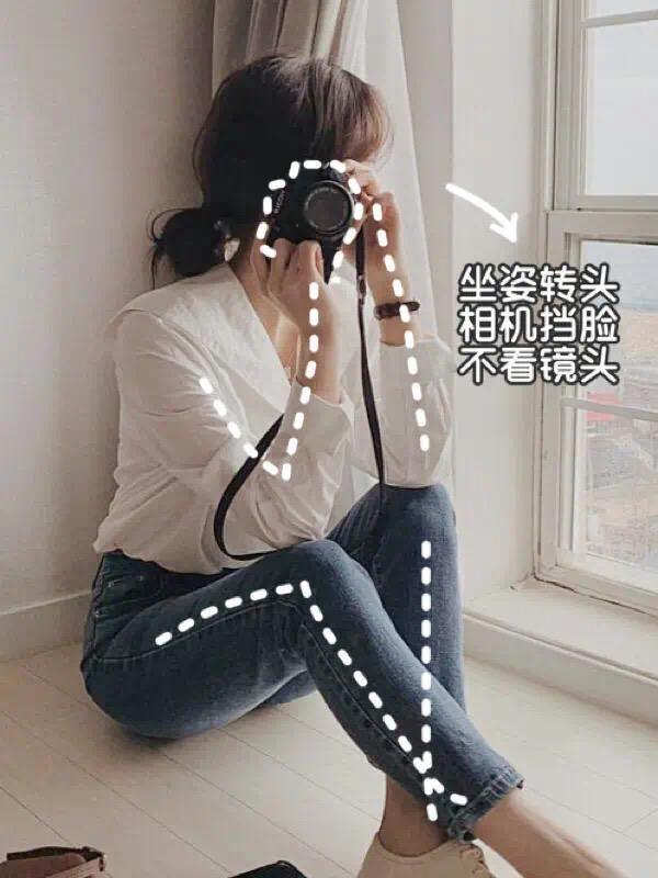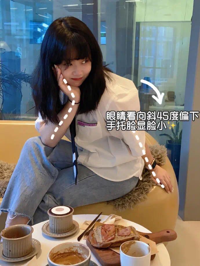 探店、打卡拍照时,这个是必备姿势,侧身坐下,一手慵懒托腮,模特头微微低下,眼神看向斜45度偏下的方向,这种既慵懒随性又带点精致的姿势显脸小的同时也能很好地避免尴尬。