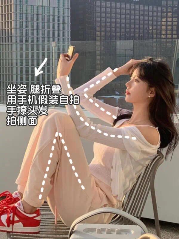 腿部折叠坐下,用手机假装自拍,模特45度抬头,做手撩发、比耶、托腮、撑脸等动作,再从人物的侧前方进行拍摄,此时人物的立体感有了,也能拍到好看的侧颜照。