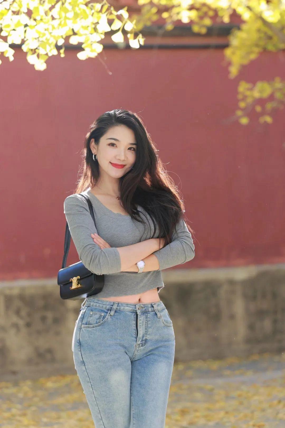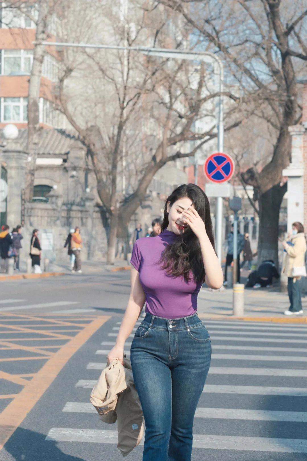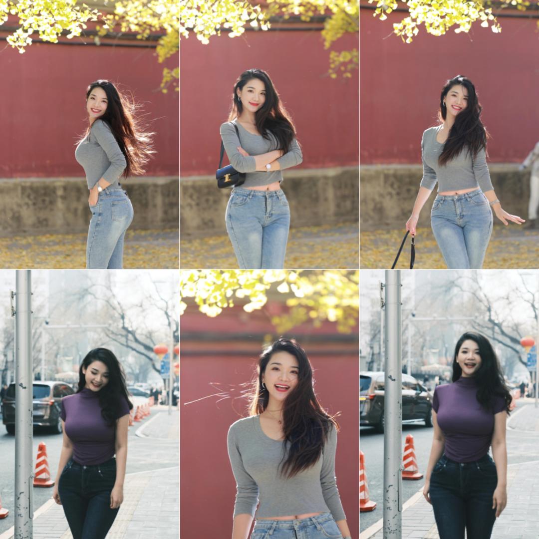 还是交叉腿站,只不过上半身换成双手抱胸,能很好地修饰上半身线条。肉肉女生拍照时,如果担心手臂显肉,这个姿势就很合适。眼睛看镜头,笑容自然点,整个人的状态就会很有亲和力,画面感十足。