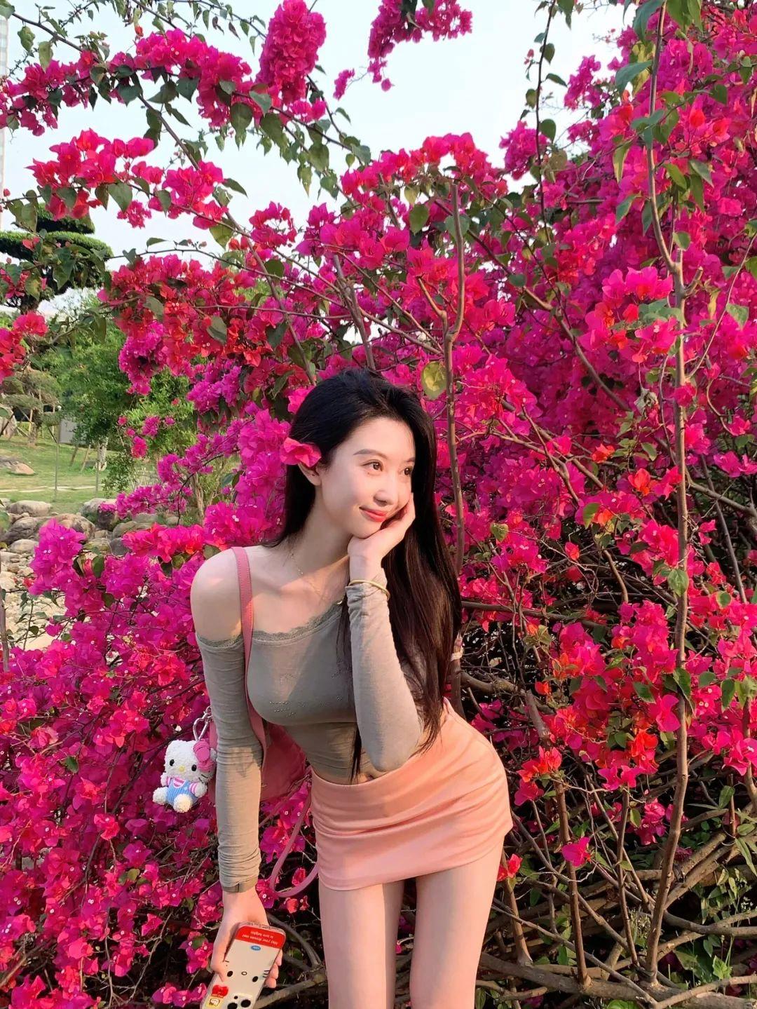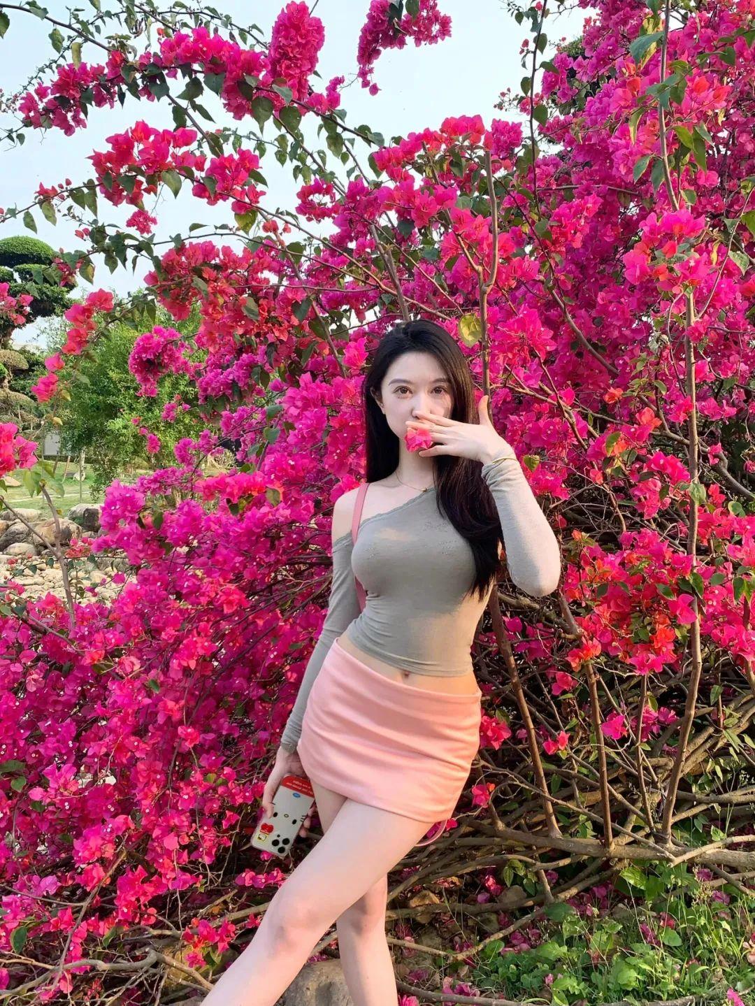 如果手上刚好有小花,可以用来做点缀。站着的时候,把一只脚侧着抬起来,一只手拿花靠近嘴边,不用看镜头也没关系。小裙子拍照用这个动作很加分,带点俏皮感,又很有生活气息。腿部线条也显得更修长,整体特别上镜。