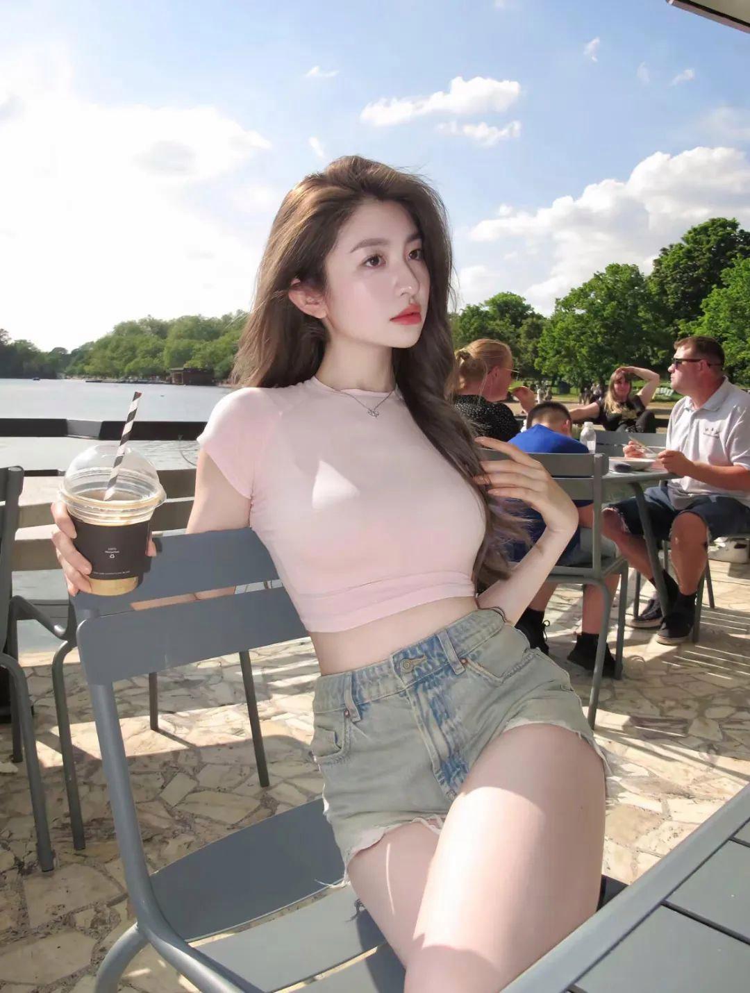 手里拿一杯咖啡,坐在凳子边缘,双腿自然交叉,目光看向远方。这个动作很有生活感,短裤拍照时营造出一种慵懒轻松的氛围。腿型自然延展,上身微微前倾,显得特别上镜又好看。