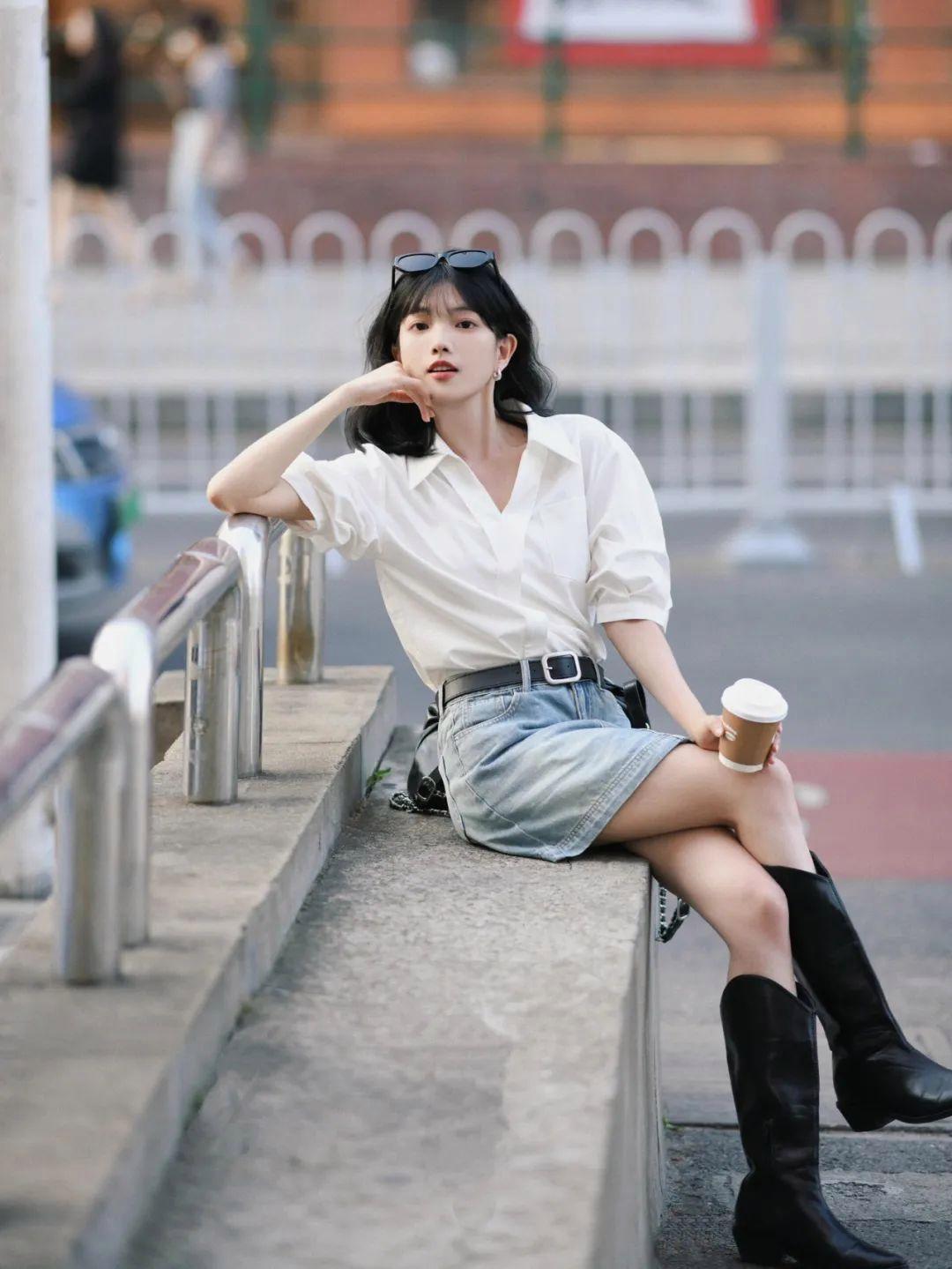 街头citywalk拍照可以坐下来拍。侧身坐着,一条腿翘起来,显得整个人状态很放松。一只手拿咖啡,另一只手托着腮帮子,回头看镜头。这个姿势配合街头椅子或台阶,很适合拍出时尚感。