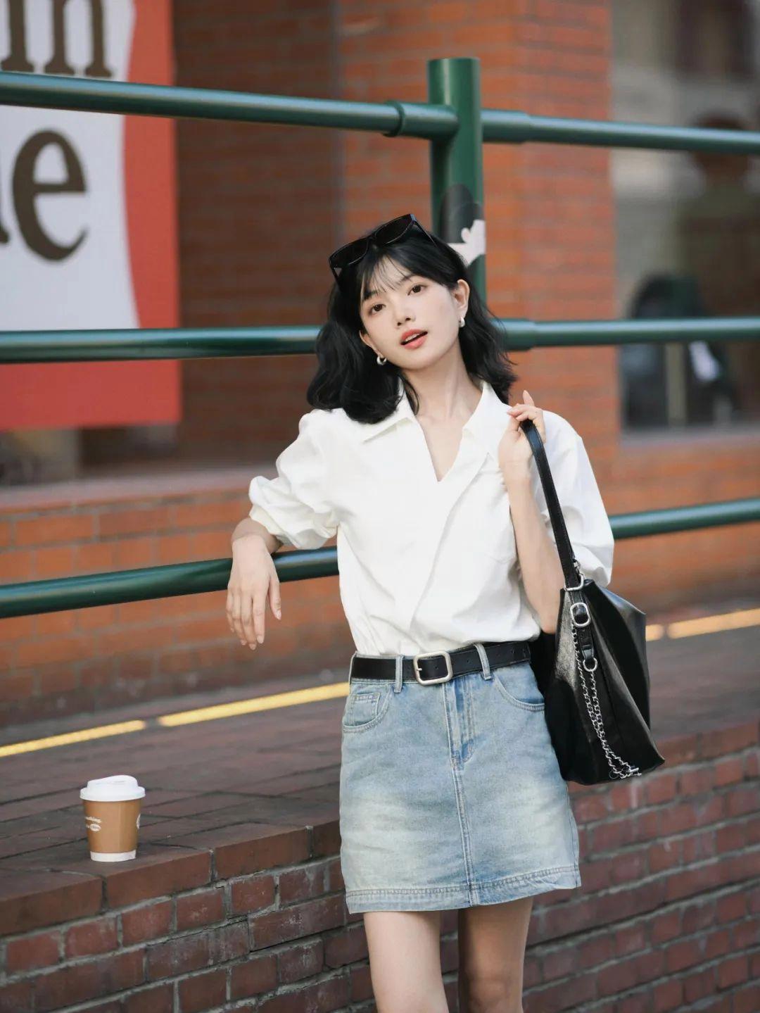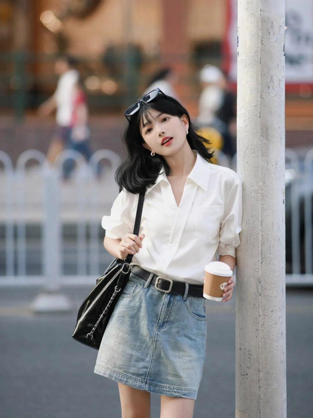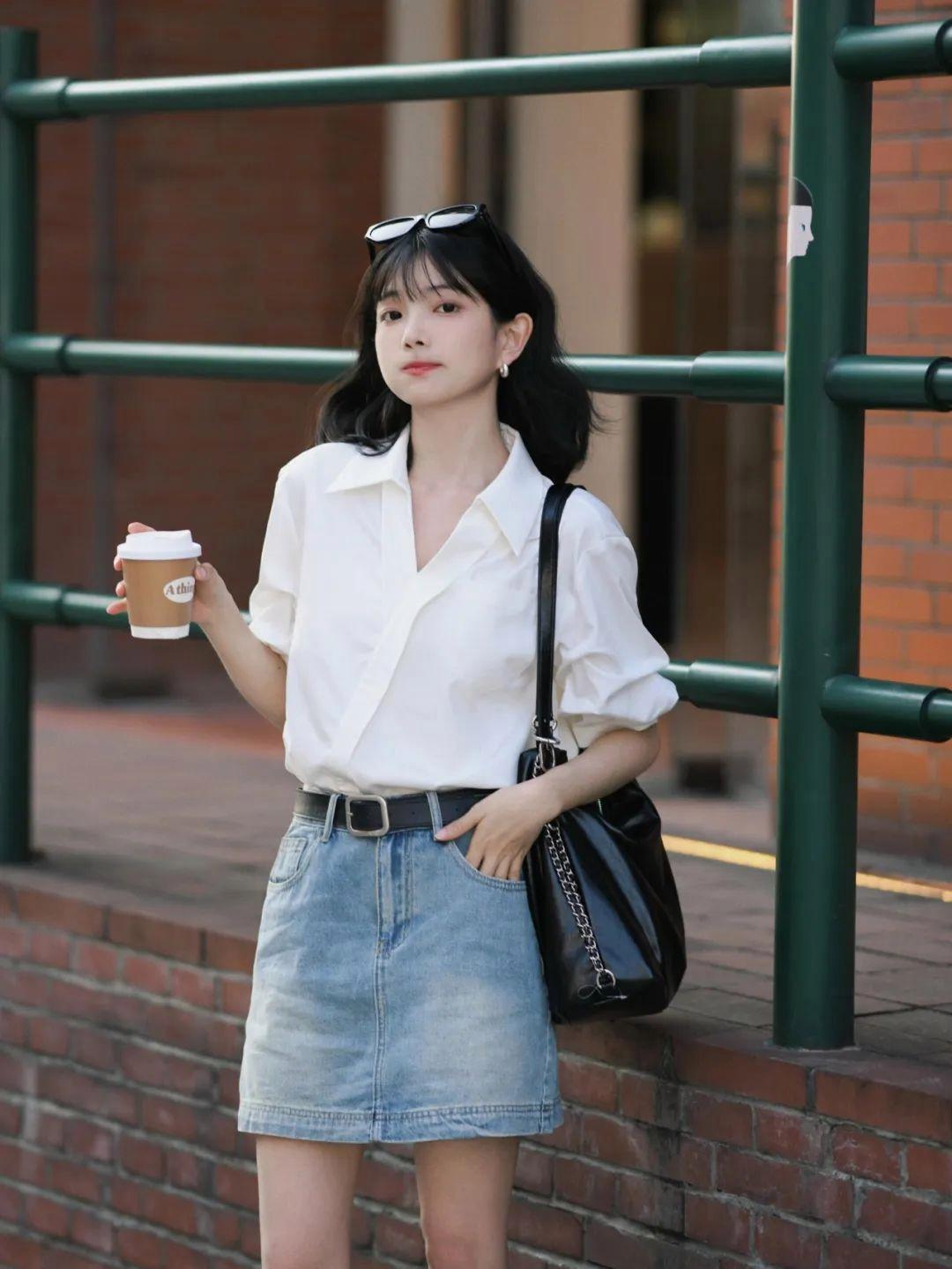 背靠着街边的栏杆或墙,轻松站着,一只手拿着咖啡,目光望向远方。这个姿势简单好操作,不看镜头更自然。加上咖啡道具,整体氛围就出来了,显得人很松弛,好看又大方。