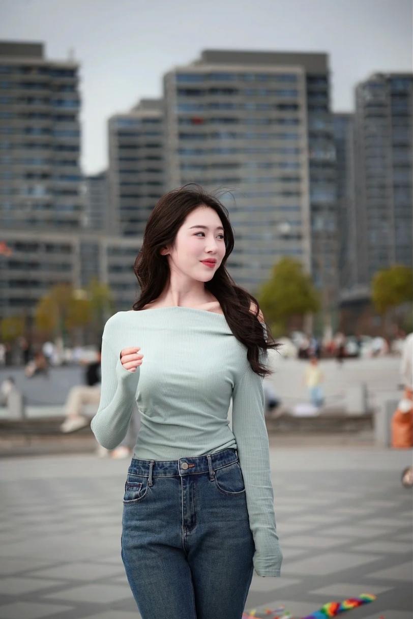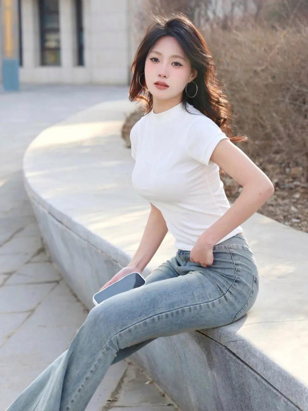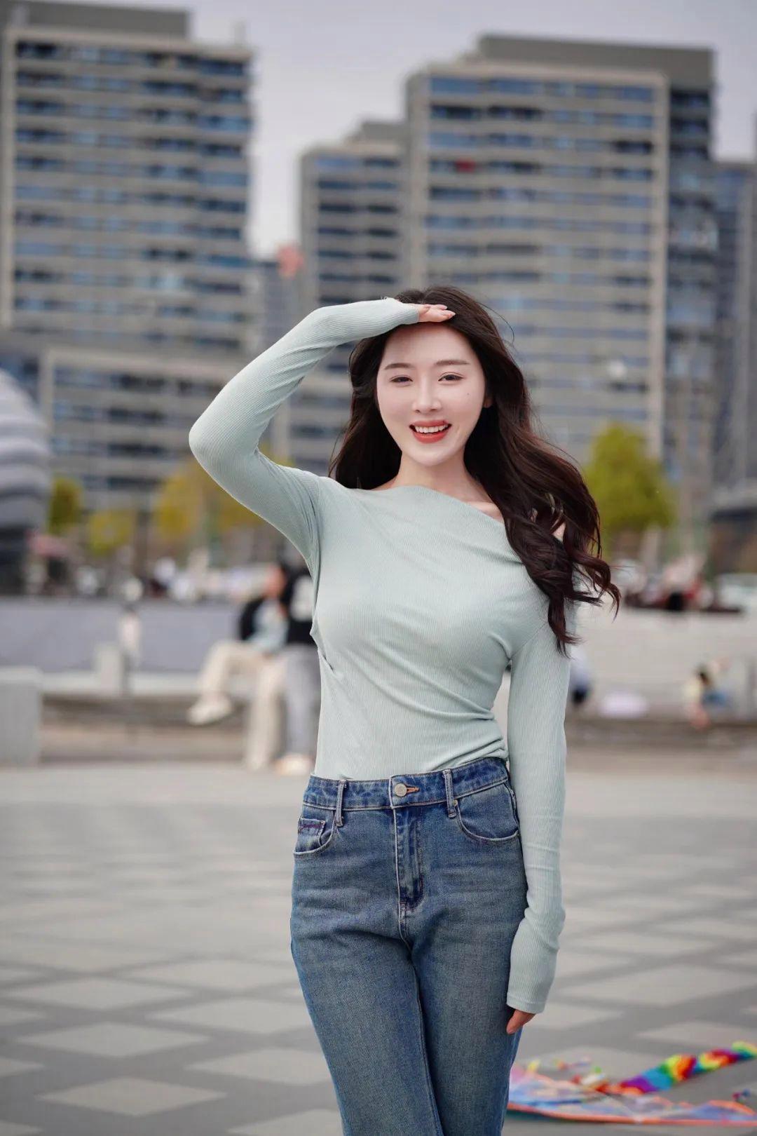 不看镜头会让表情更放松。穿着牛仔裤,站姿自然,单手轻抬像在整理头发,眼神看向别处,画面显得很松弛。这个拍法特别适合营造生活感,又不会刻意凹造型,显瘦显身材。