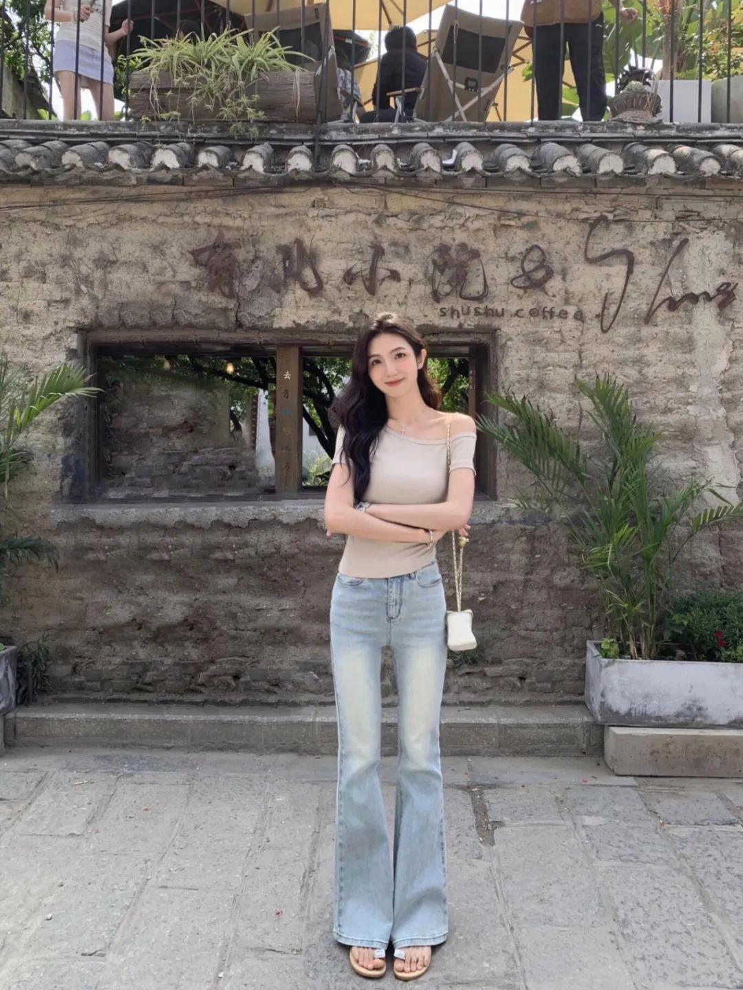 这是一个很实用的拍照动作。牛仔裤拍全身照时,不需要太多动作,双脚并拢站好就行。一只手拎包,另一只手自然遮阳,表情放松。这个姿势看起来很有夏天的气息,也特别适合光线柔和的街头场景。拍出来显得腿直、腰细,还带着一点轻熟气质。
