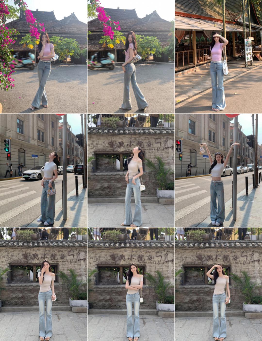 街头光线好的时候,试试这个动作。牛仔裤搭配简单上衣,站着微微侧身,手里拿手机,另一只手自然遮阳。人看起来很自然,笑容轻松,带点生活感。这种姿势很适合抓拍,看起来特别有夏日气息,也很显身材。