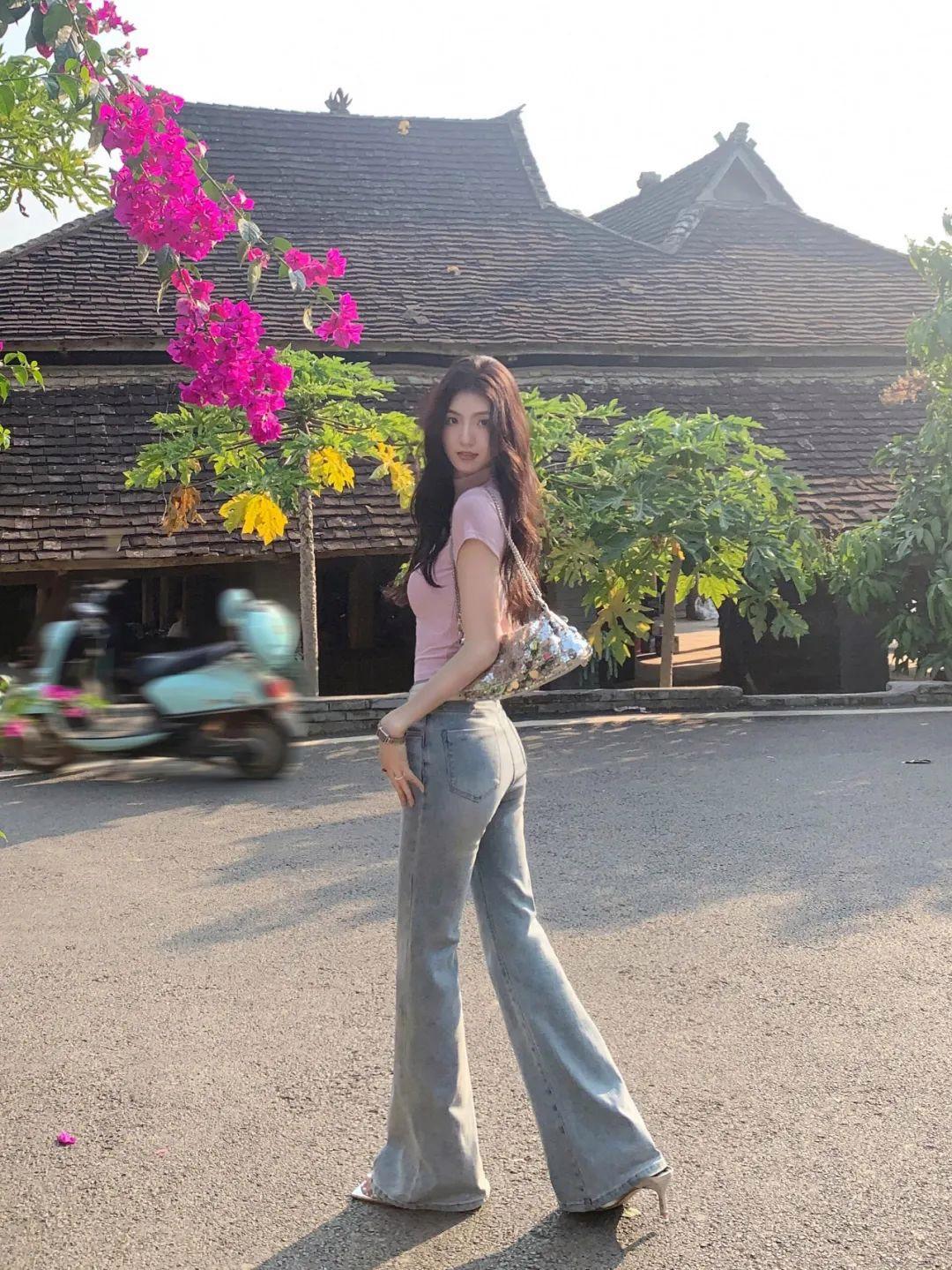 牛仔裤拍全身照时,可以用交叉腿的方式让腿部线条更自然。一手轻环腰,另一只手捂嘴轻笑,这样既显瘦又带点俏皮感。整个人看起来很松弛,身材比例也会被拉长。拍出来的照片又辣又有气质,不需要太用力,状态放松就很出片。