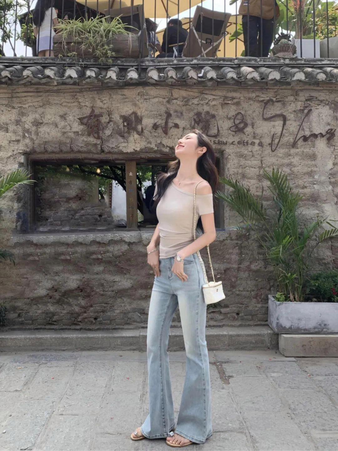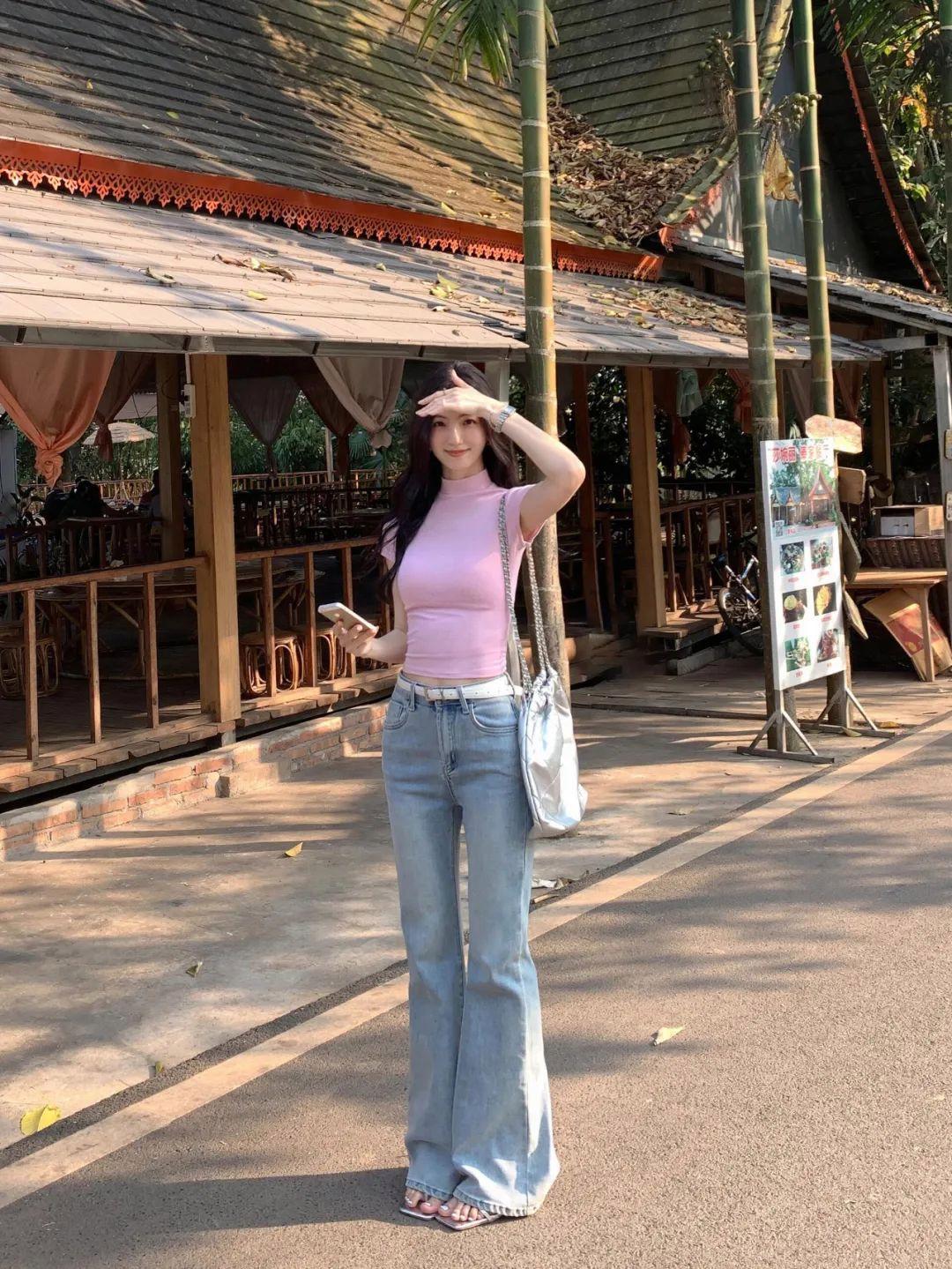 想拍出松弛又有气质的感觉,可以试试这个动作。牛仔裤搭配短上衣,站立时曲一条腿,身体侧转,双手插兜,头轻轻仰起闭眼笑。整个人看起来特别放松,自信又大方。牛仔裤的版型可以勾勒出腿部线条,显身材效果也非常好。