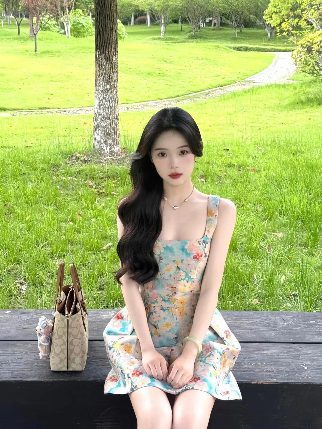 坐在长椅的状态也可以时尚感十足。双手挎着包包放在肩膀一边,眼神看向镜头,会有一种出神的感觉,照片安静又舒服,很适合穿连衣裙或短裙时拍。