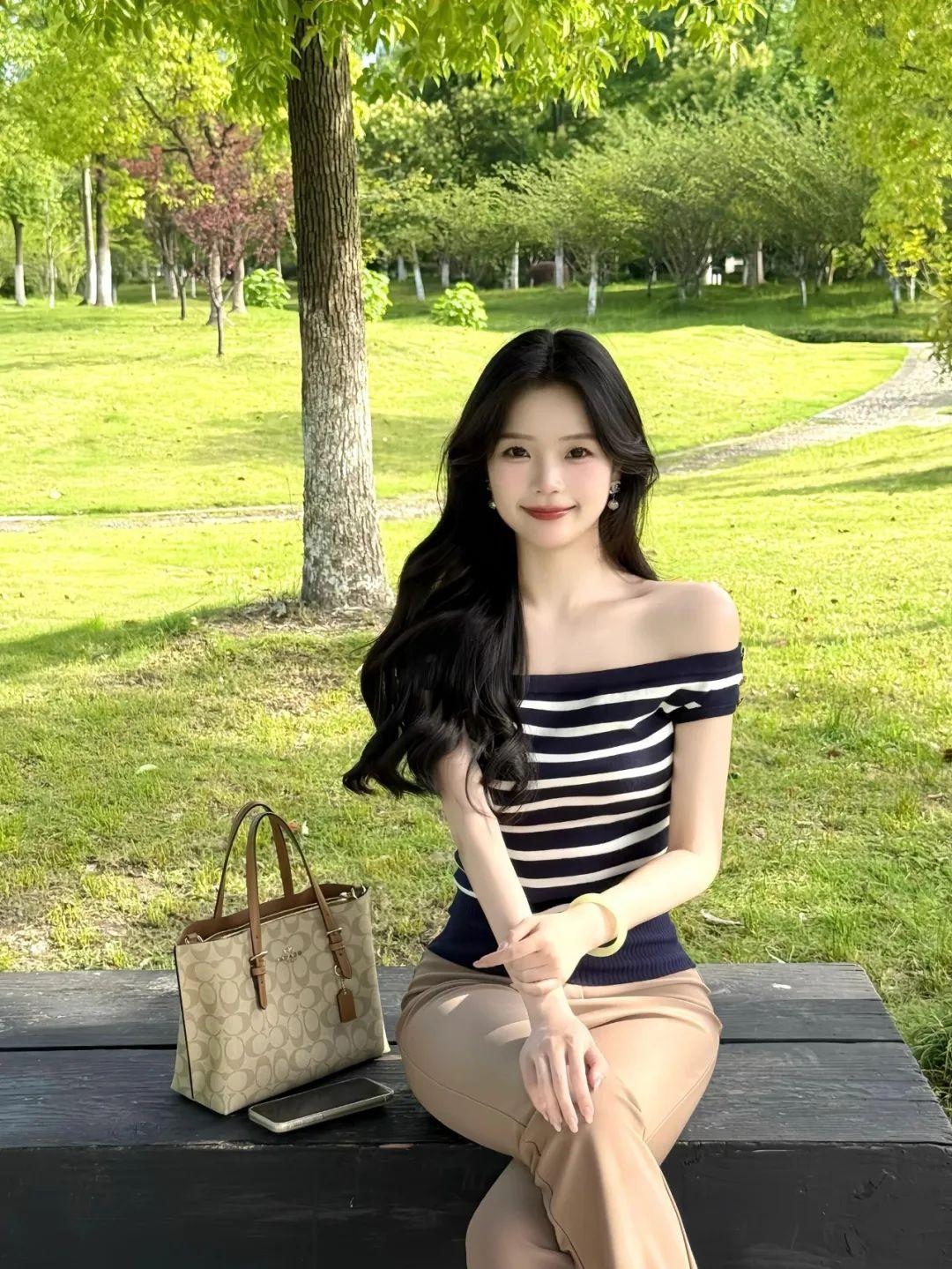 公园长椅拍照时加点互动动作更出片。一边放着提包,另一只手轻轻撩头发,坐姿放松又自然。笑容一出来,整张照片就活了,温柔又显好松弛气质。