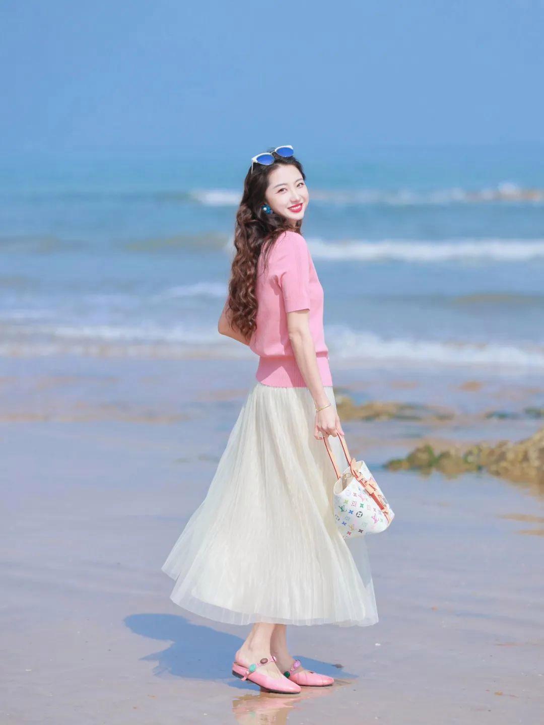 行走中的动作,最容易拍出松弛感。穿裙子拍照时,挎着包包,自然走在路上,转头看别的方向,脸上带着轻松的笑容。裙摆随风飘起,步伐轻盈,这样的照片很有夏天的自由感。