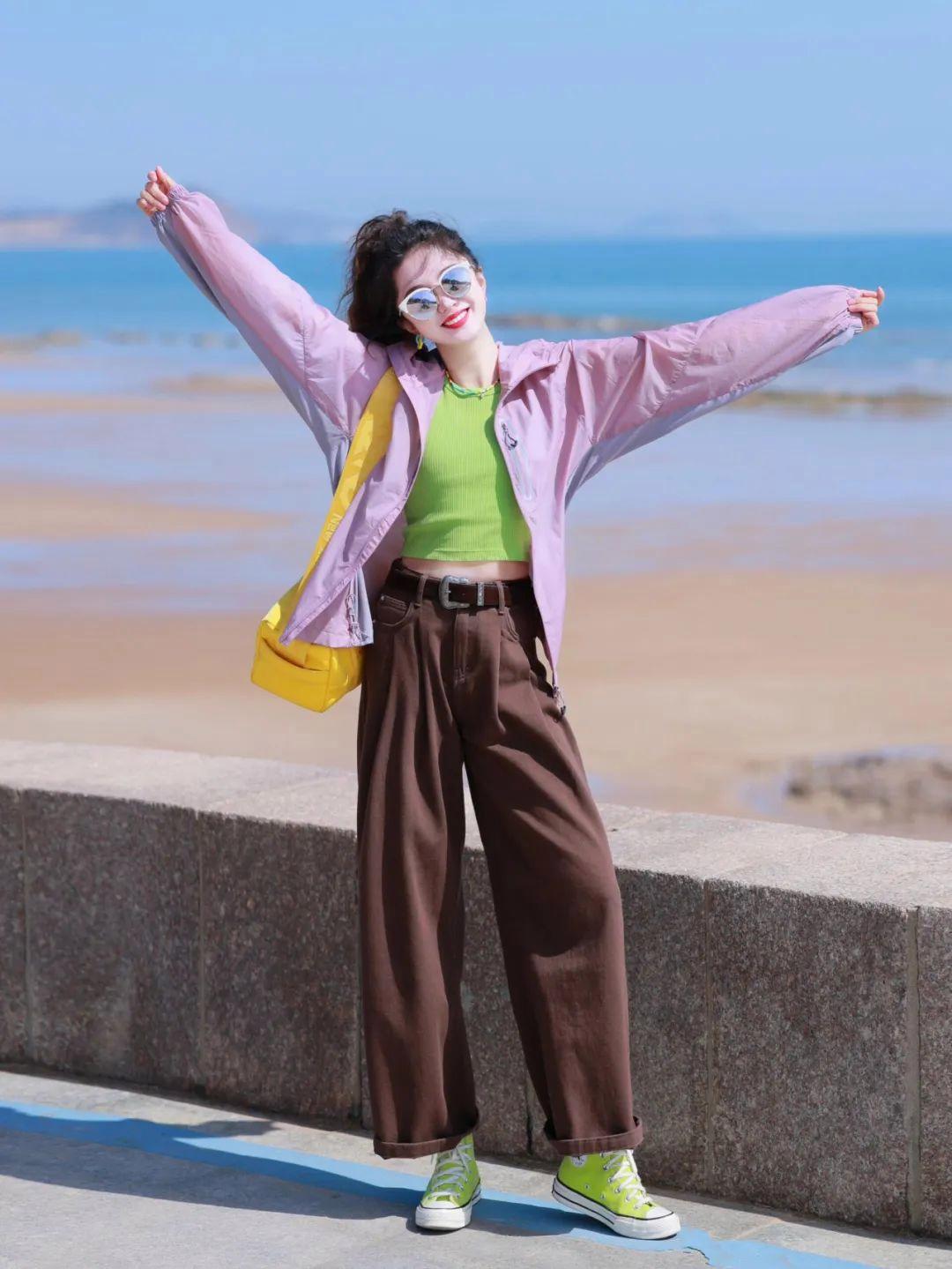 站着的时候,把双脚自然跨开,双手举起来,可以是比耶、也可以是随意举高,歪头微笑,看起来特别轻松。外出拍照这样摆,动作越大越好看,不会显得呆板,反而有青春活力感。