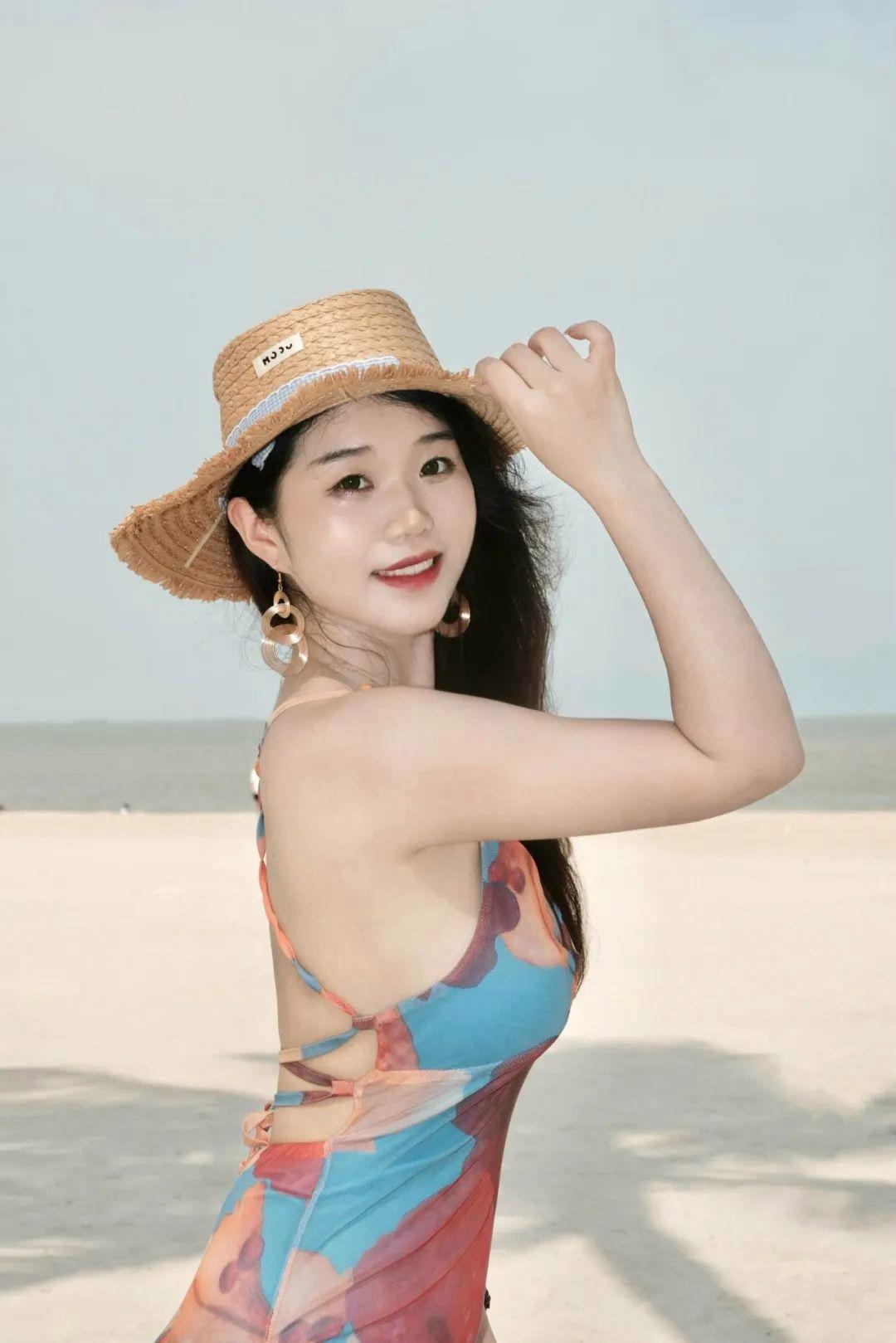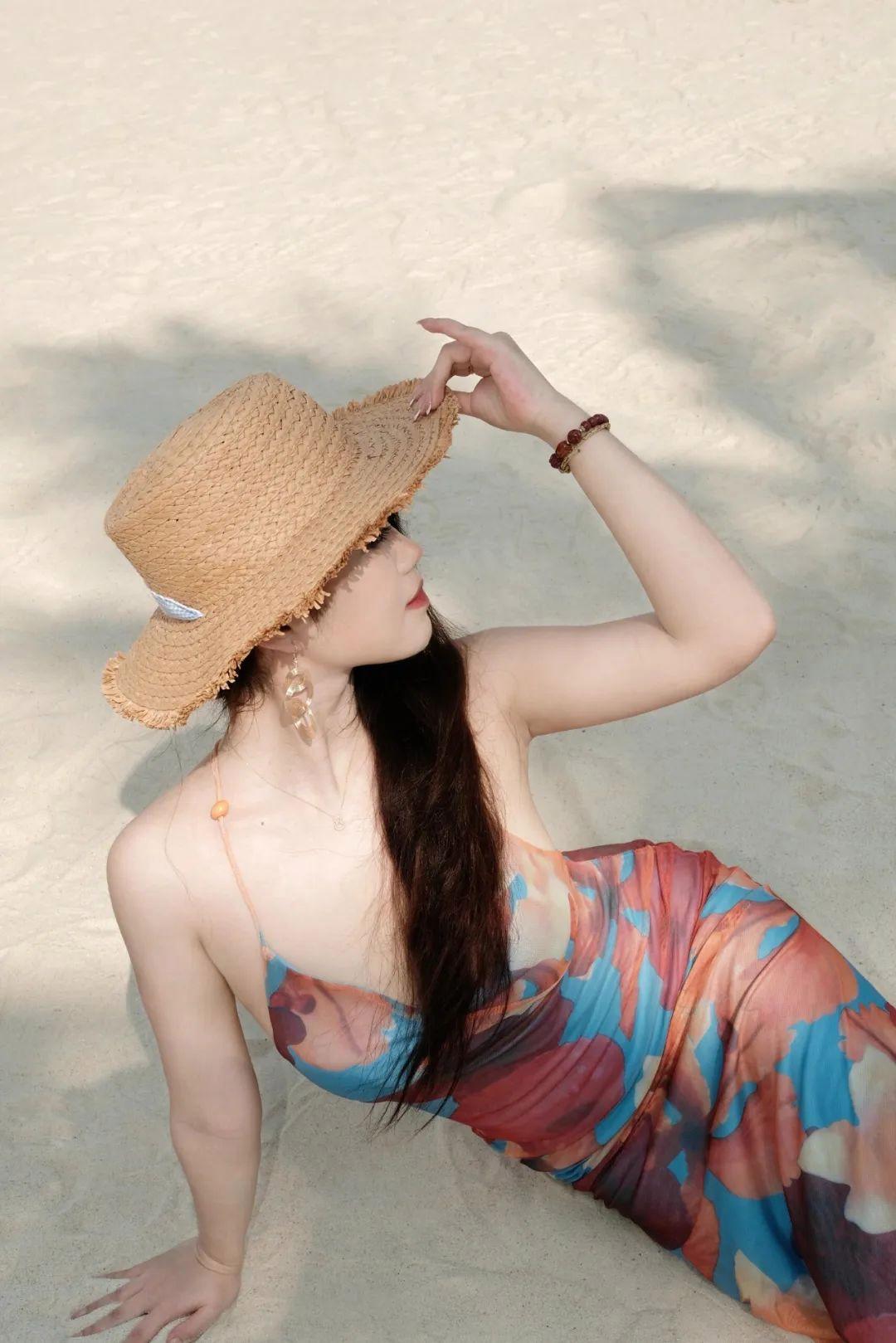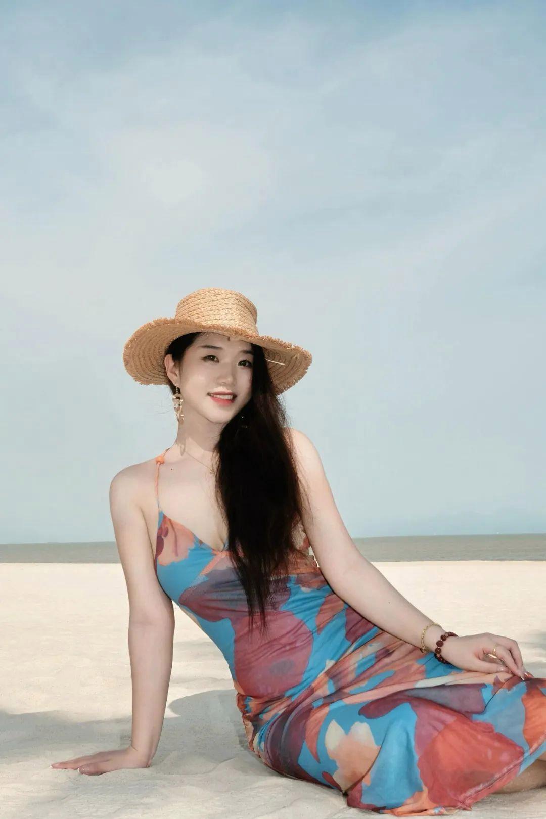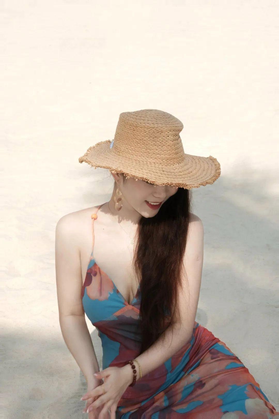 双手同时扶着帽檐,坐在沙滩上,脸朝着一侧,笑得轻松自然。裙子散开在身边,和帽子的搭配,很有夏日氛围。拍出来的照片既漂亮又大方,完全没有刻意感,身材比例也很好看。