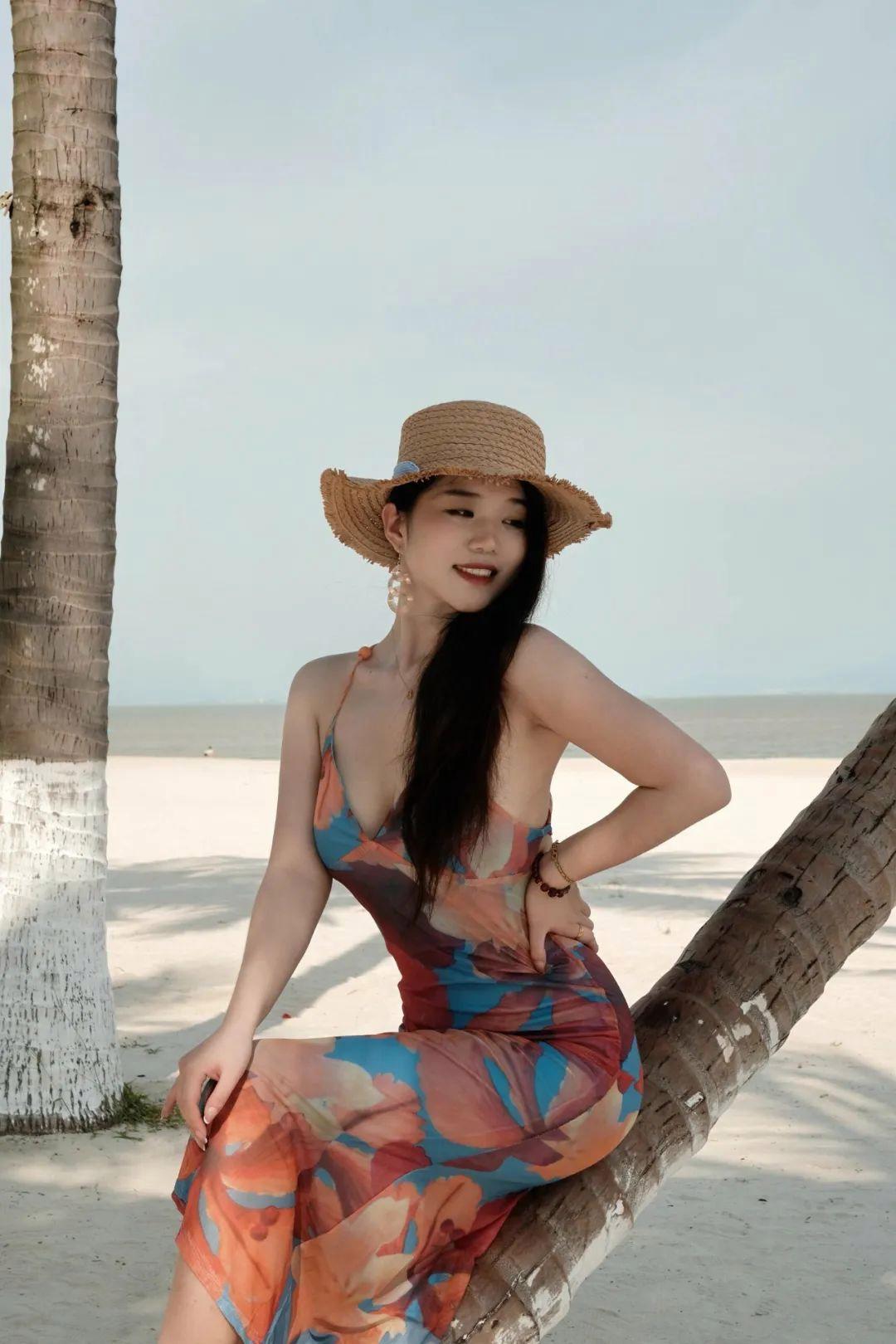 在海边找一棵树,靠着树干侧坐下来,一只手叉腰,回头带着笑容,裙子铺在腿边,轻松又自然。这个姿势不挑人,很容易就拍出大片感,特别有氛围,显得身材曲线很好。