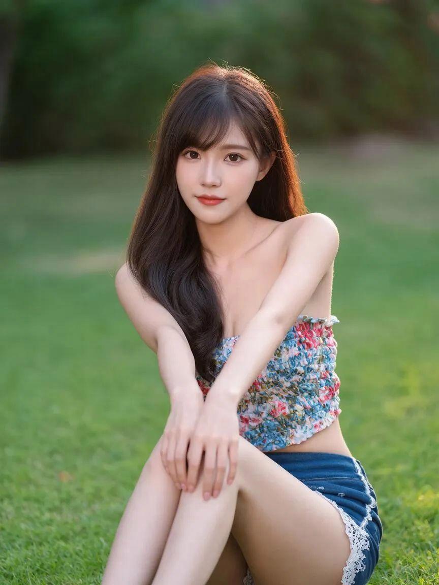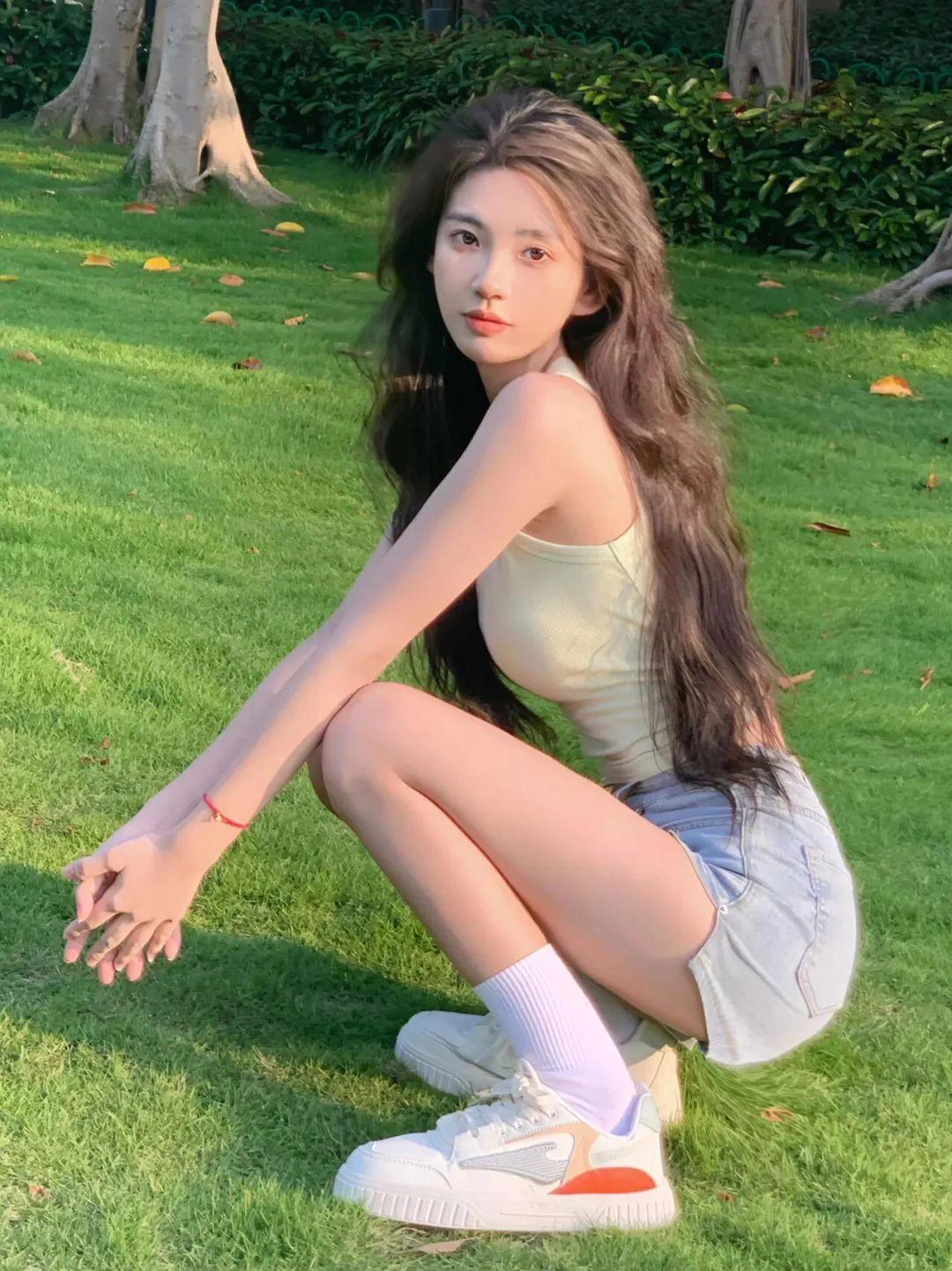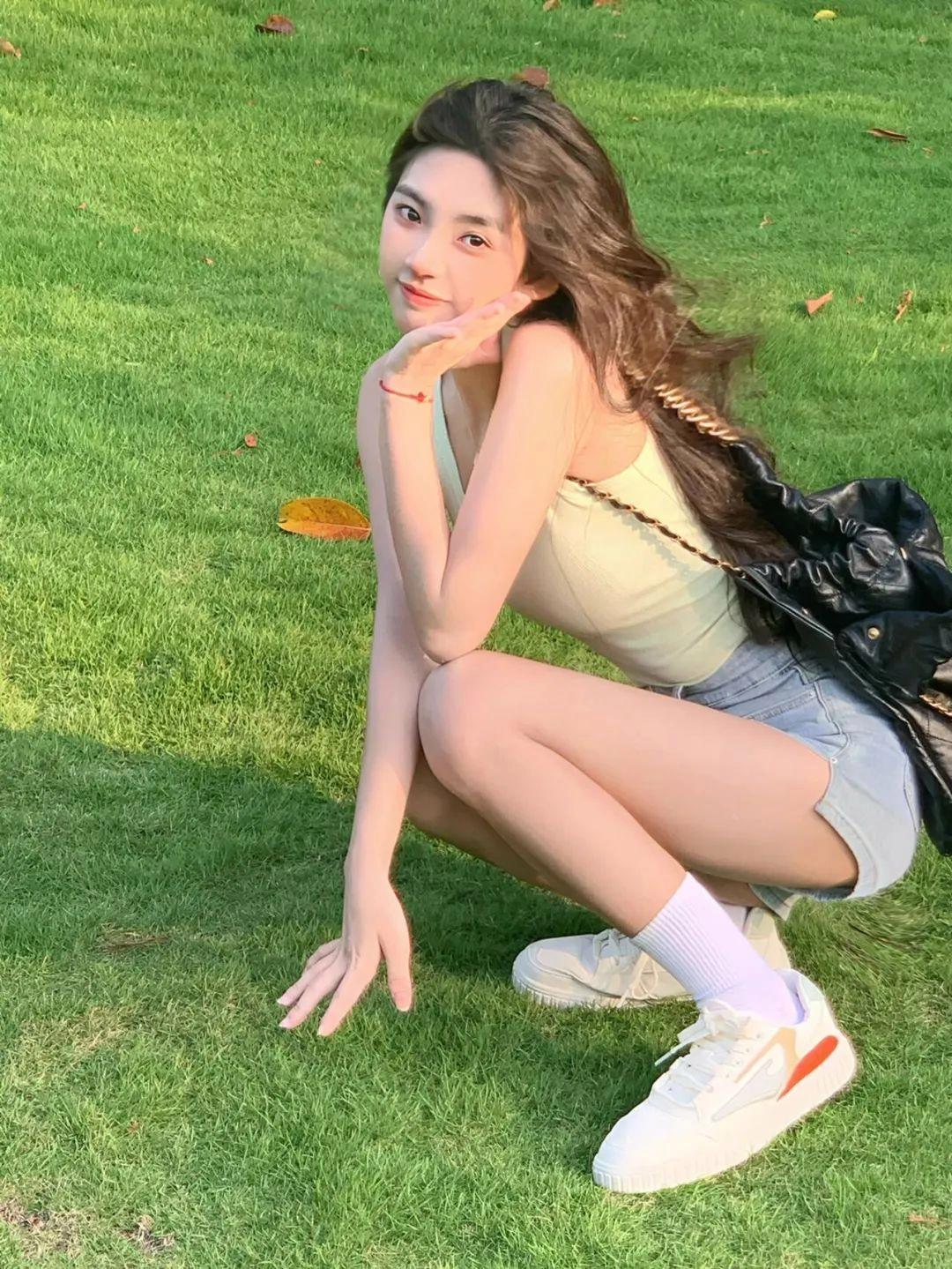 草坪草地拍照,最简单的方式就是自然地坐下来。双腿轻轻弯曲,双手搭在膝盖上,看向镜头微微一笑。这个动作很放松,既能展现气质,也能拍出干净清爽的画面,特别适合穿裙子或者宽松上衣时拍。