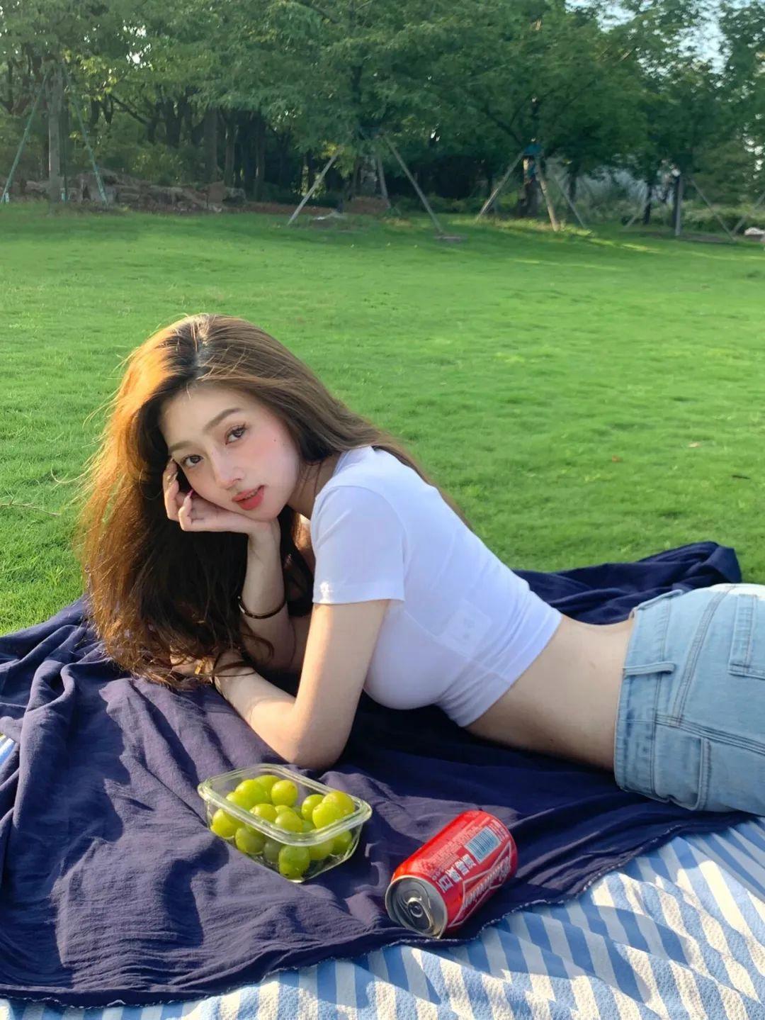 换一种慵懒的姿势也很有趣。躺在草地上,侧身靠着,一只手自然撑着地面,另一只手抬起来伸个懒腰。头回过来看镜头,笑容带点轻松的味道。这样的照片看起来就很生活化,不造作,特别好看。