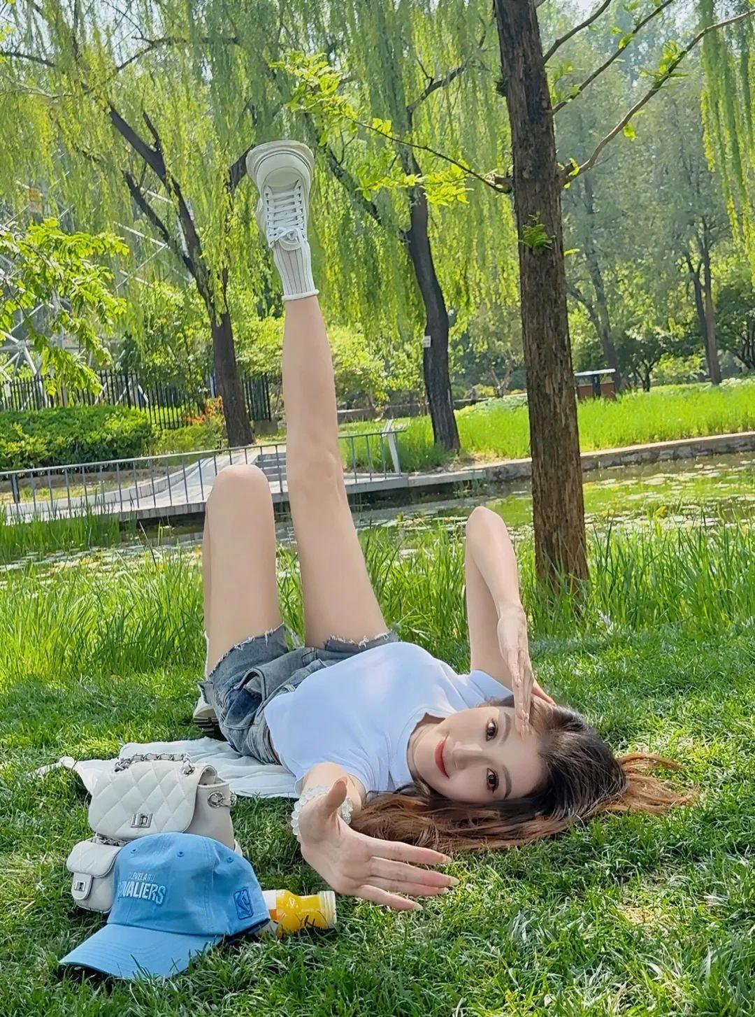 草地草坪拍照时,可以直接躺下来,背对镜头,头微微回转,手遮住阳光,嘴角带笑。一条腿稍微抬起,整个人状态看起来很舒服。这个动作适合草地干净一点、阳光柔和的时候拍,画面氛围感十足。