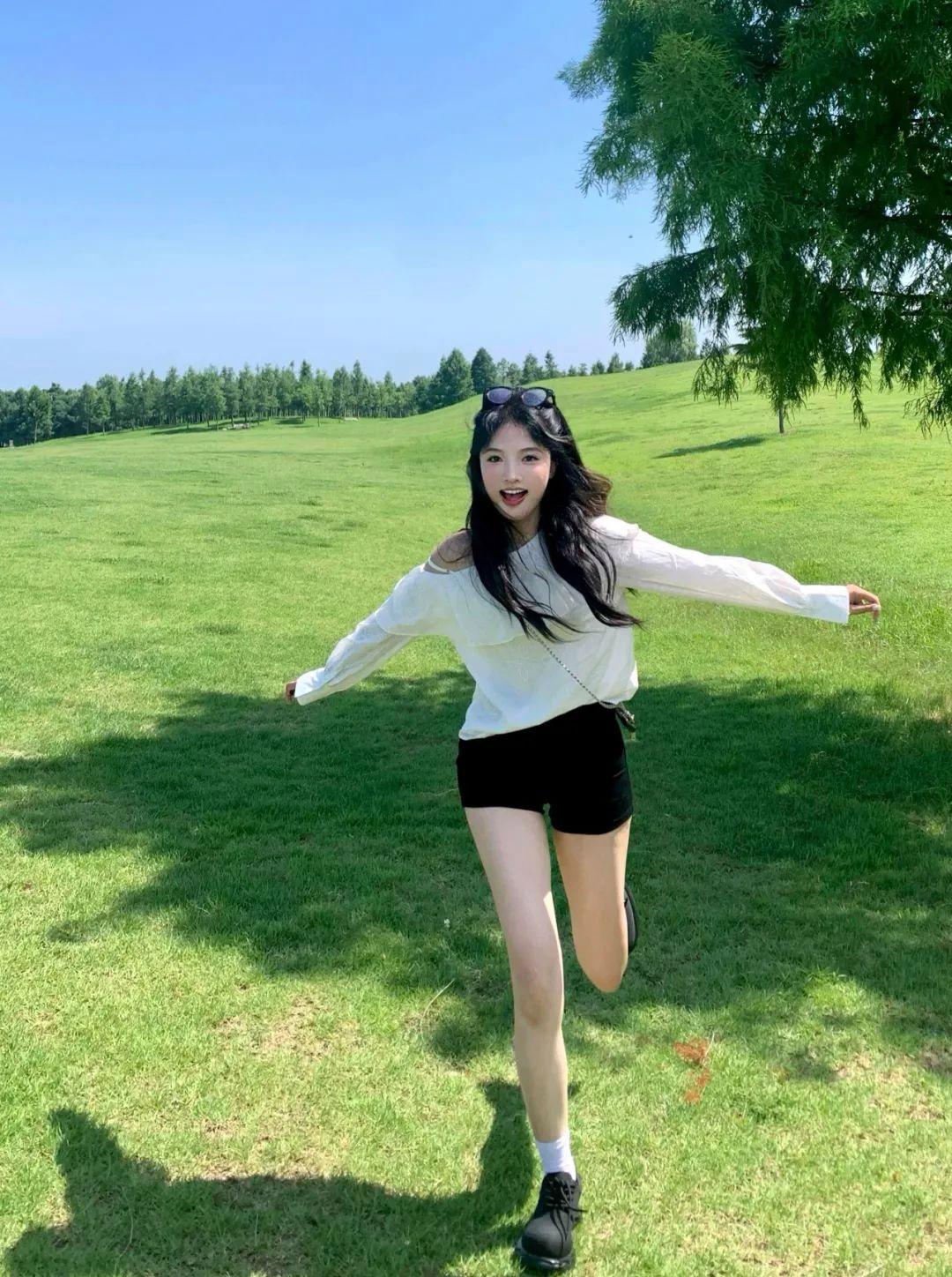 想要拍出草地拍照的生命力感,试试这个动作。正面朝镜头慢跑,手张开,就像在迎接风一样。笑容越自然越好,抓拍的瞬间最有活力。这种姿势特别适合拍连拍,动态定格会更出片。