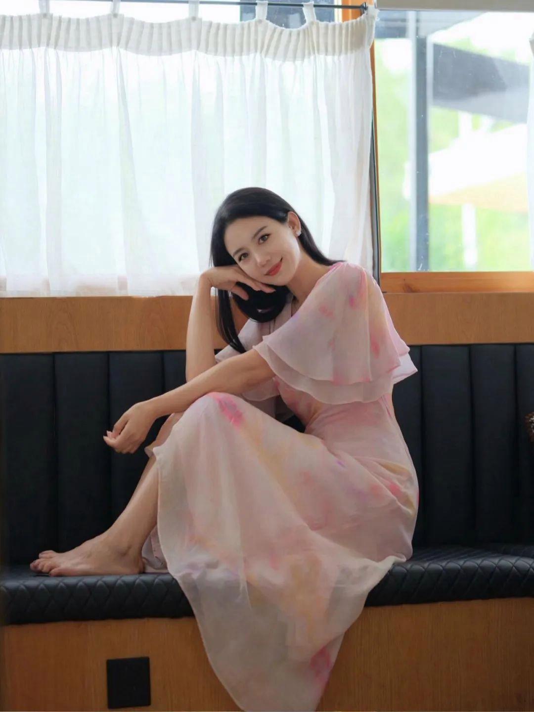 坐姿拍照更能展现裙子的优雅感。坐下后将一条腿轻轻叠起来,面朝镜头自然地笑一笑,不需要刻意凹造型。穿长裙或中裙这样拍特别有气质,腿型也显得更修长,整体状态舒服又大方。