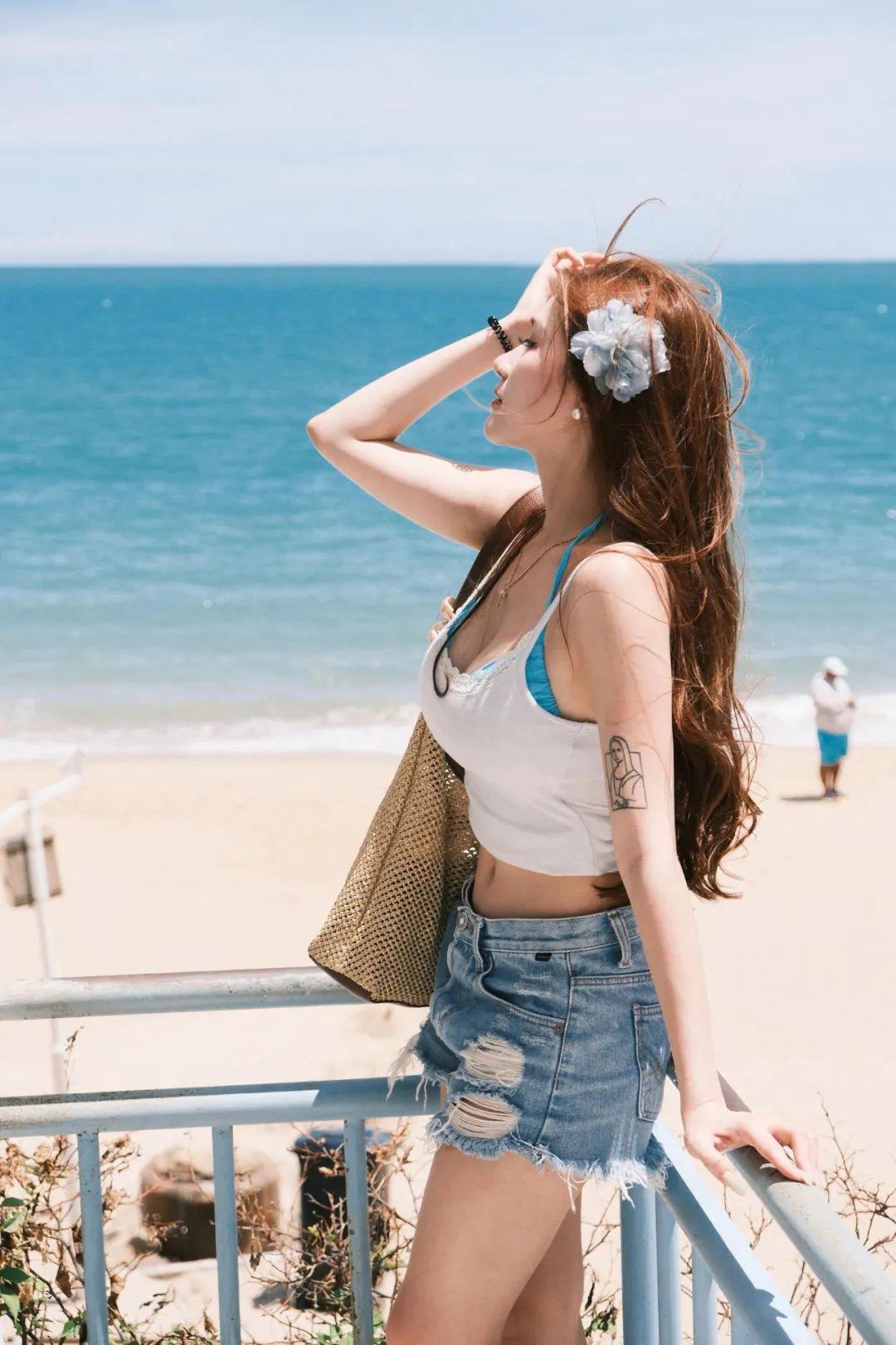 这是一个带点小情绪的动作。侧身对镜头,一只手轻轻抓头发,头略微仰起,看向远方。不用看镜头,让整个画面看起来更自然、有氛围。适合穿短裤搭配吊带,显得身材轻盈又有型。