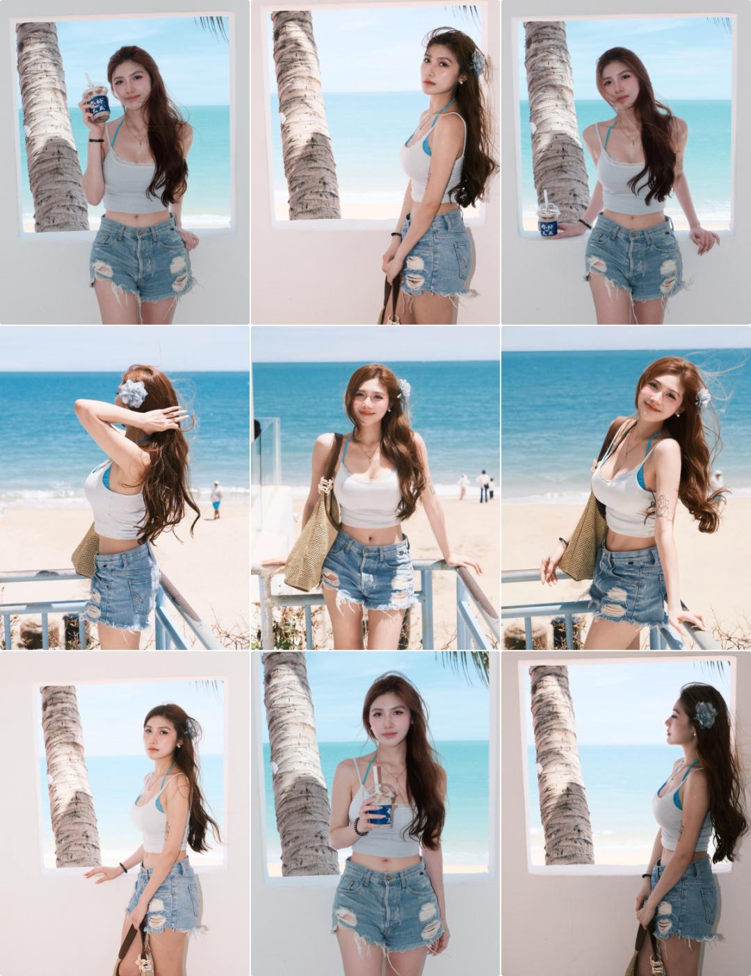 这是穿短裤最基础也最百搭的一个姿势。面对镜头站好,双手自然撑在栏杆上,眼神温柔地看向镜头,脸上带一点点笑意。这种姿势松弛又有氛围,腿的比例也会被拉长,看起来清爽又有朝气。