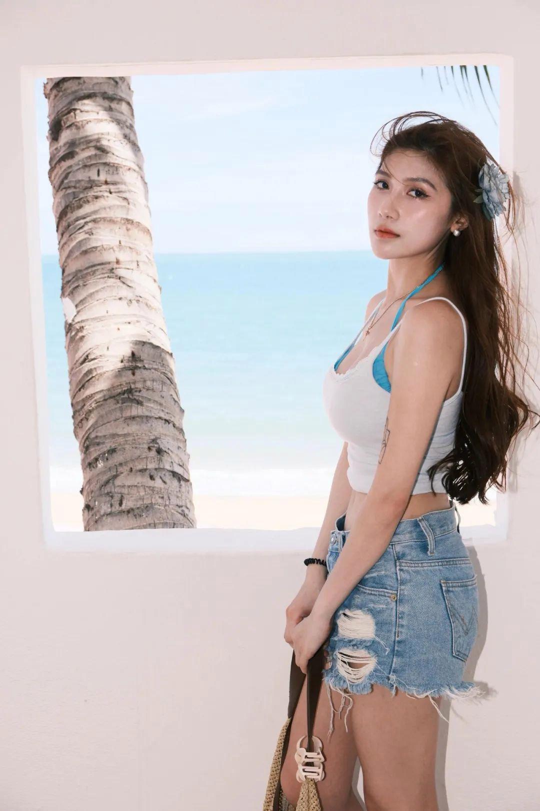 如果想拍出一点点“酷”的感觉,可以靠着窗边,身体自然站好,一只手往后撑着。这个动作有点松弛的慵懒感,视觉上拉长了腿部比例,也更能突出牛仔短裤的显瘦显身材的优势。