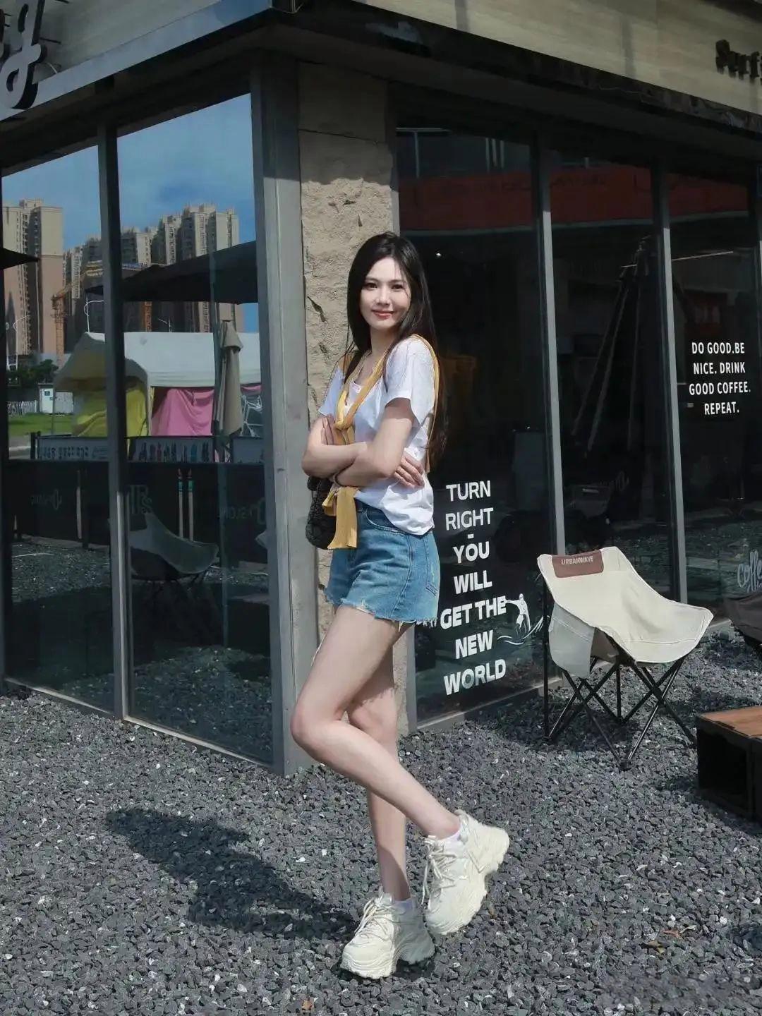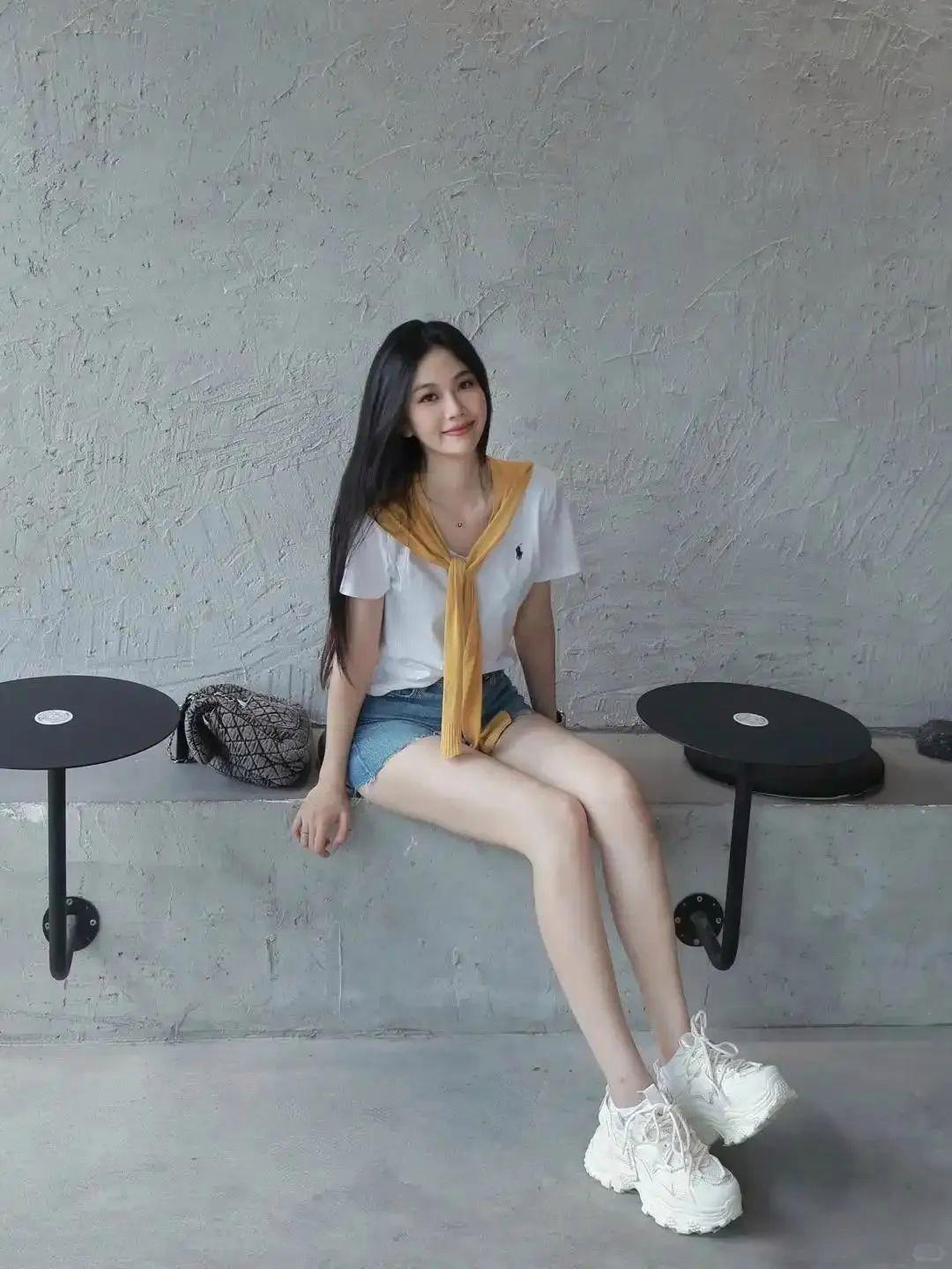 虽然是站姿主题,但穿牛仔裤坐着拍也能拉长腿部线条。坐下时一条腿轻轻往侧边摆,整个下半身显得更修长。上身微微前倾,歪头看镜头,整个人有种慵懒又大方的美感,牛仔裤在这个角度显得特别利落。