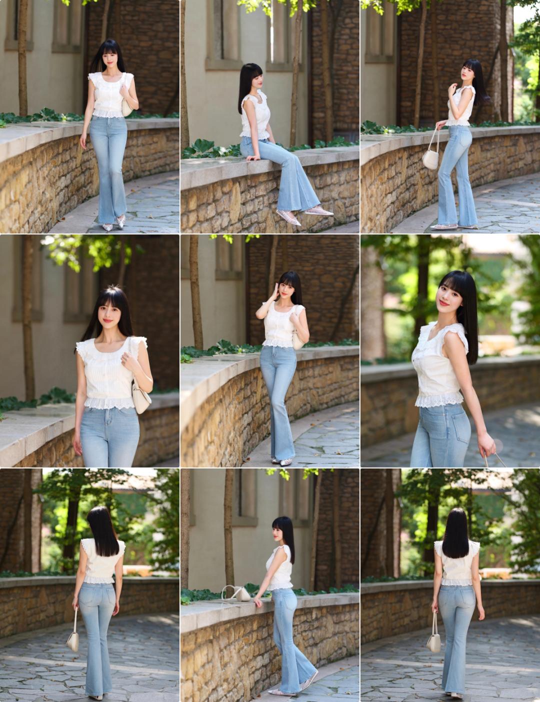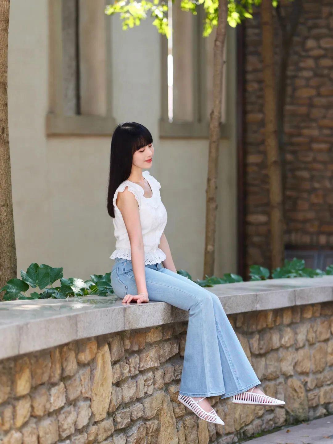牛仔裤搭配白T拍照时,将一条腿自然微曲,整个人重心偏向另一侧,再轻轻抬起手撩发,看向镜头微笑。这种姿势优雅自然,既修饰了腿型,也让人显得格外放松,气质清新又身材显苗条。.