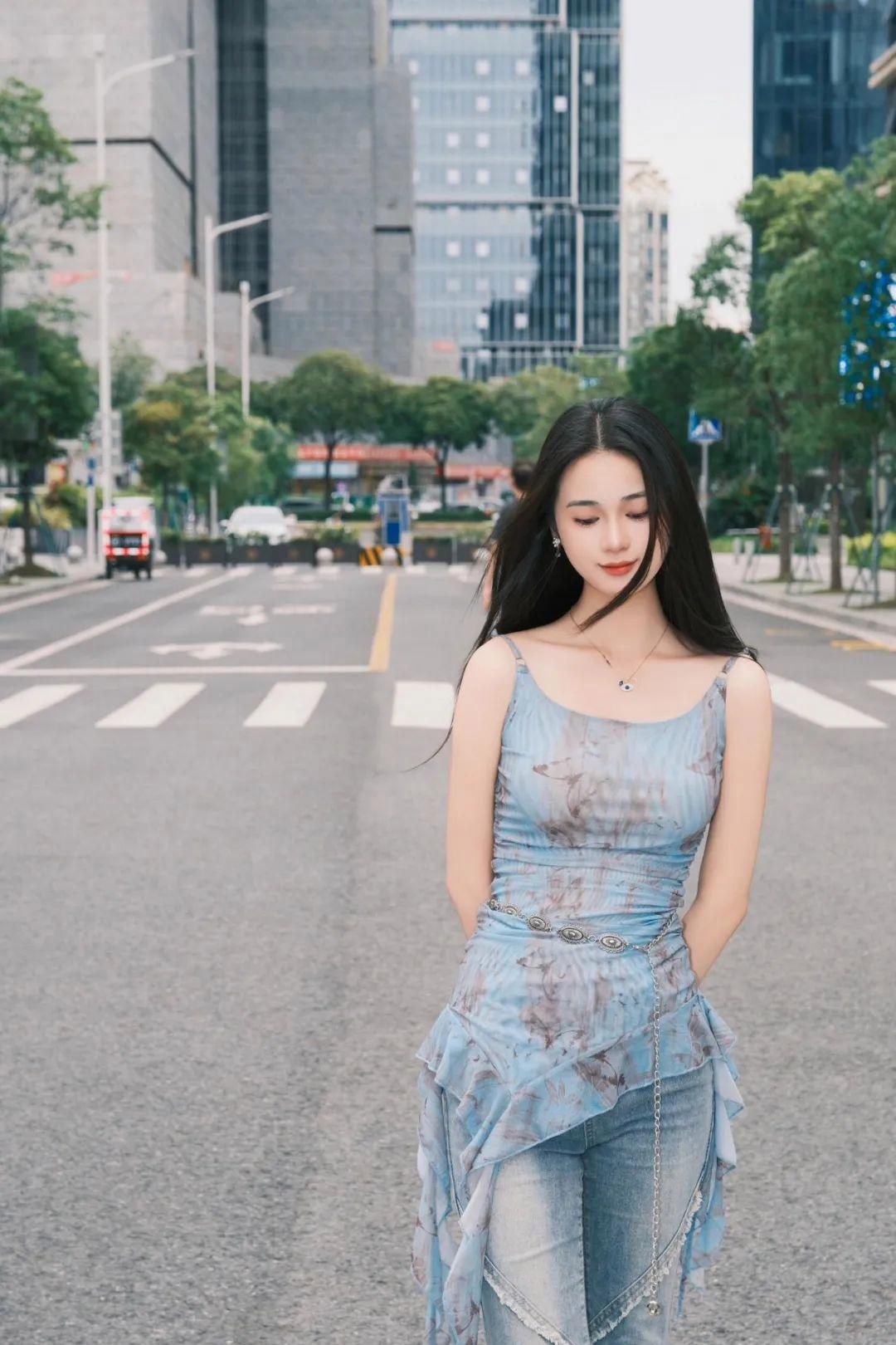 街边拍照,不看镜头更容易制造出“抓拍感”。双手仍然藏在身后,低头微笑或看着脚下,自带一份安静和文艺气质。这个姿势特别适合想要拍出轻柔、漂亮、又有一点神秘感的照片。