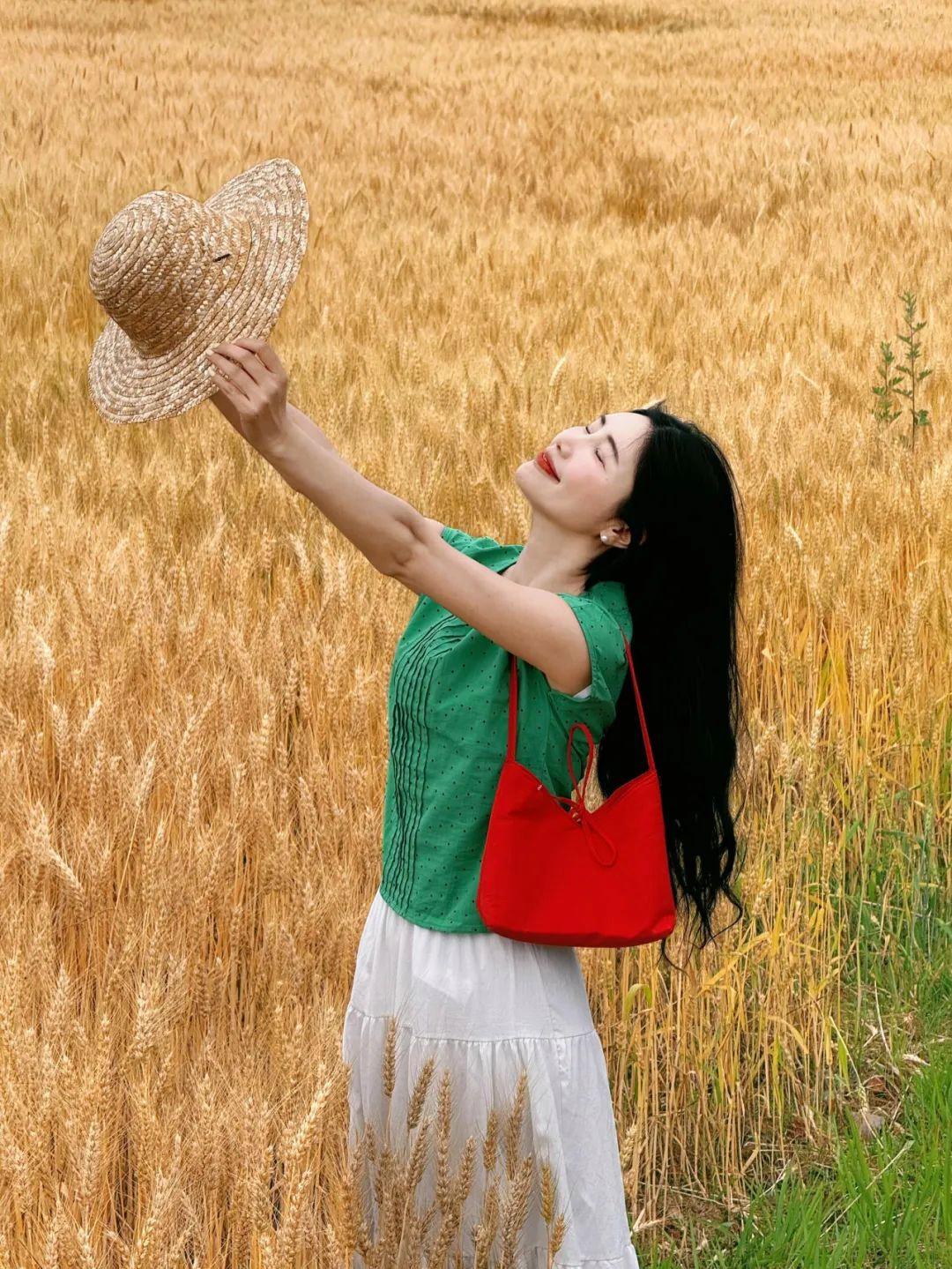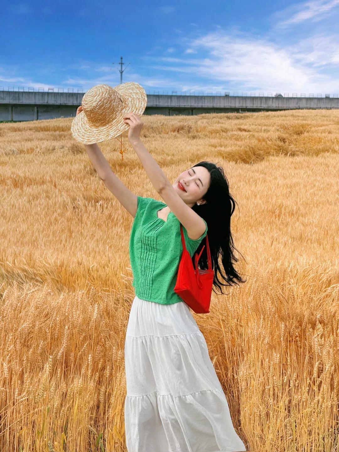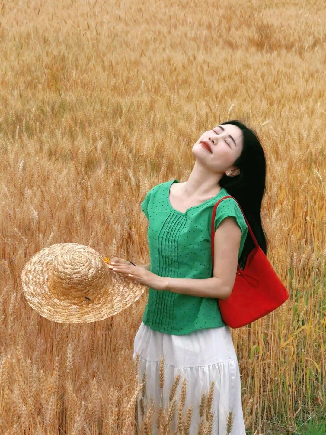 中年女士在麦田里拍照,可以让自己侧身站在麦田里,双手举帽高高的,配合仰头闭眼微笑,让摄影师抓拍。这一动作不仅自然,也更有生活气息,画面显得轻盈灵动,很自由很出片。